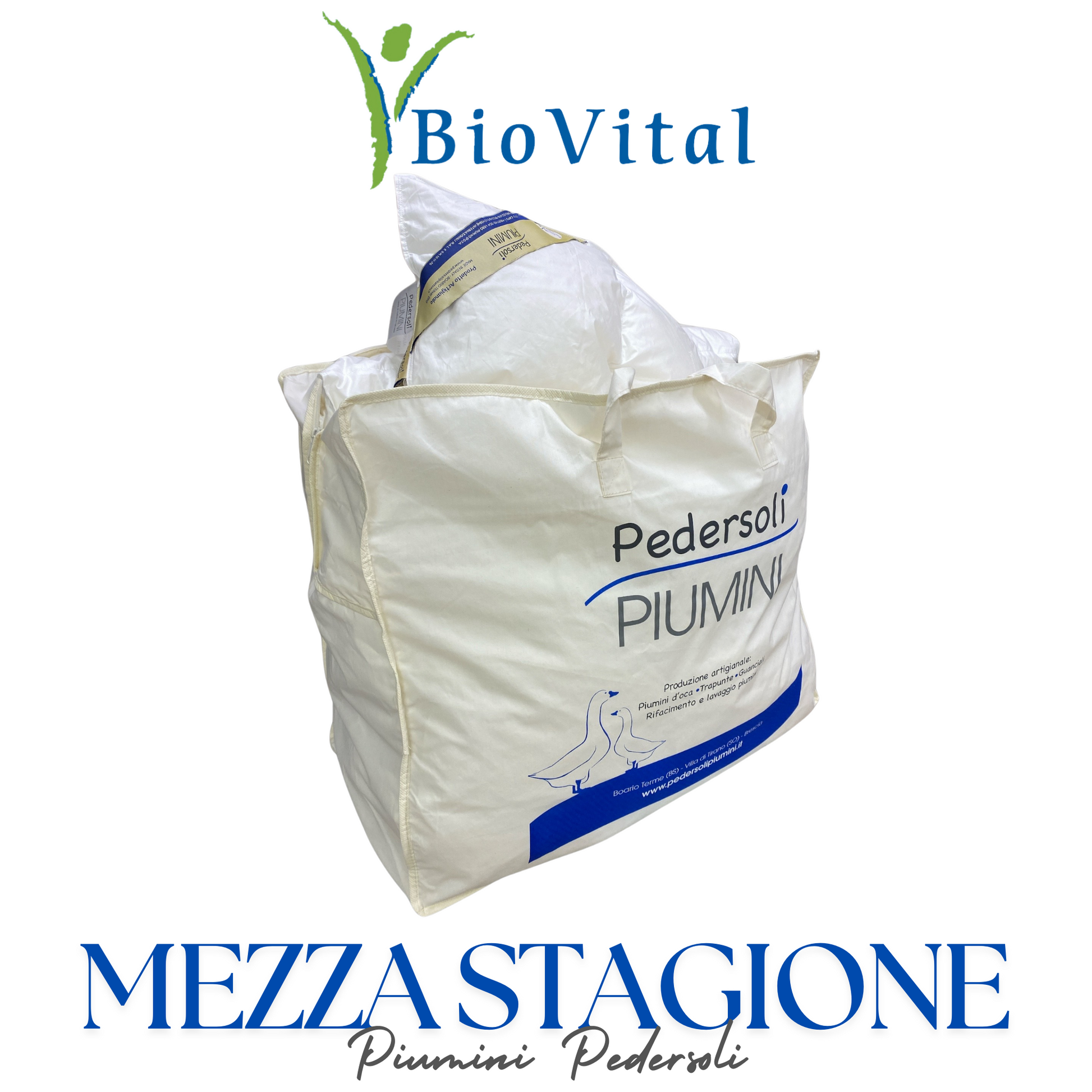 TESSUTO: puro cotone makò da 86 gr./mq con trattamento SanProCare®, con imbottitura in piumino bianco originale d'oca proveniente dall'Alaska al 99%