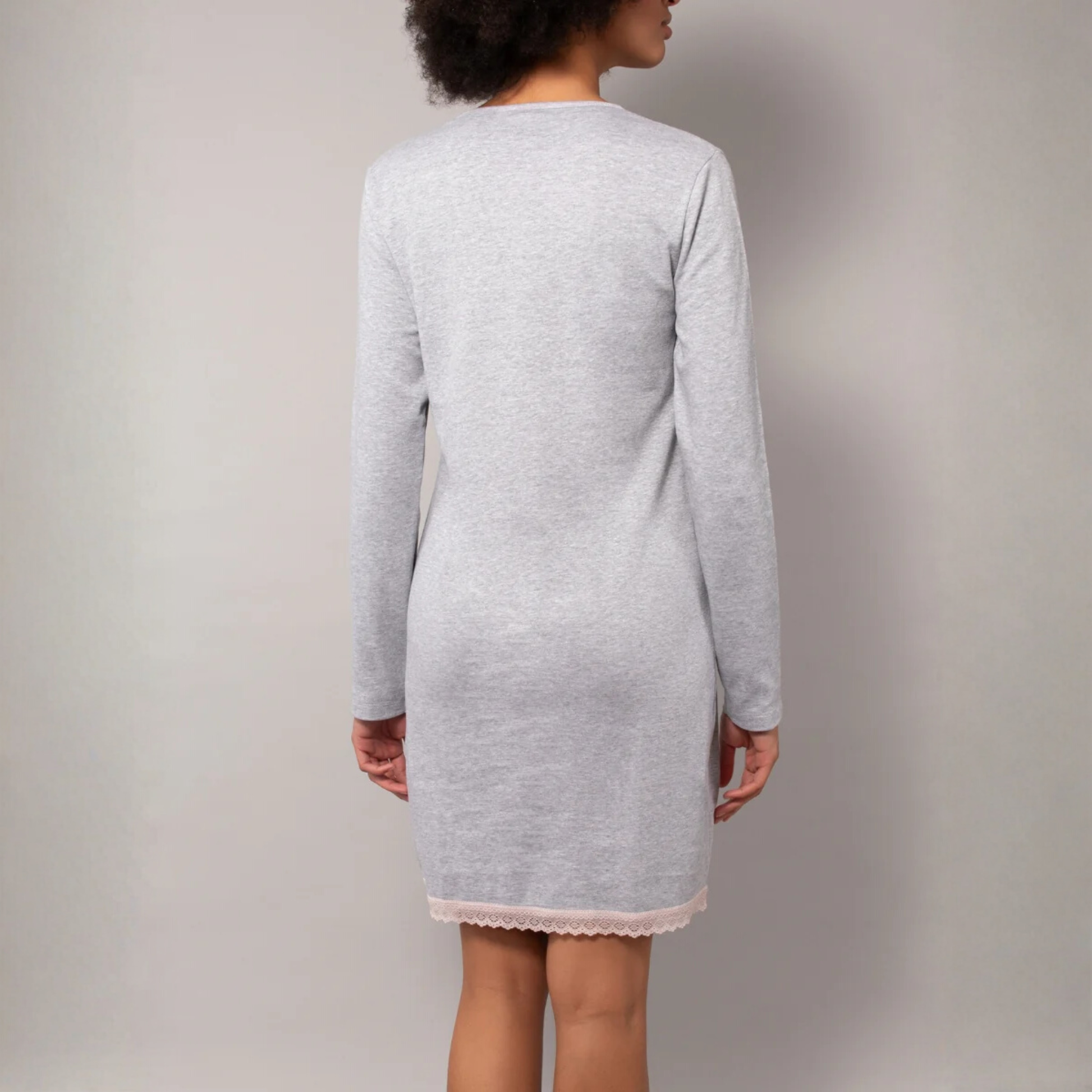 Il modello, in tinta unita grigia, presenta un elegante collo serafino e un delicato bordo in pizzo rosa sul fondo, che aggiunge un tocco femminile e romantico.