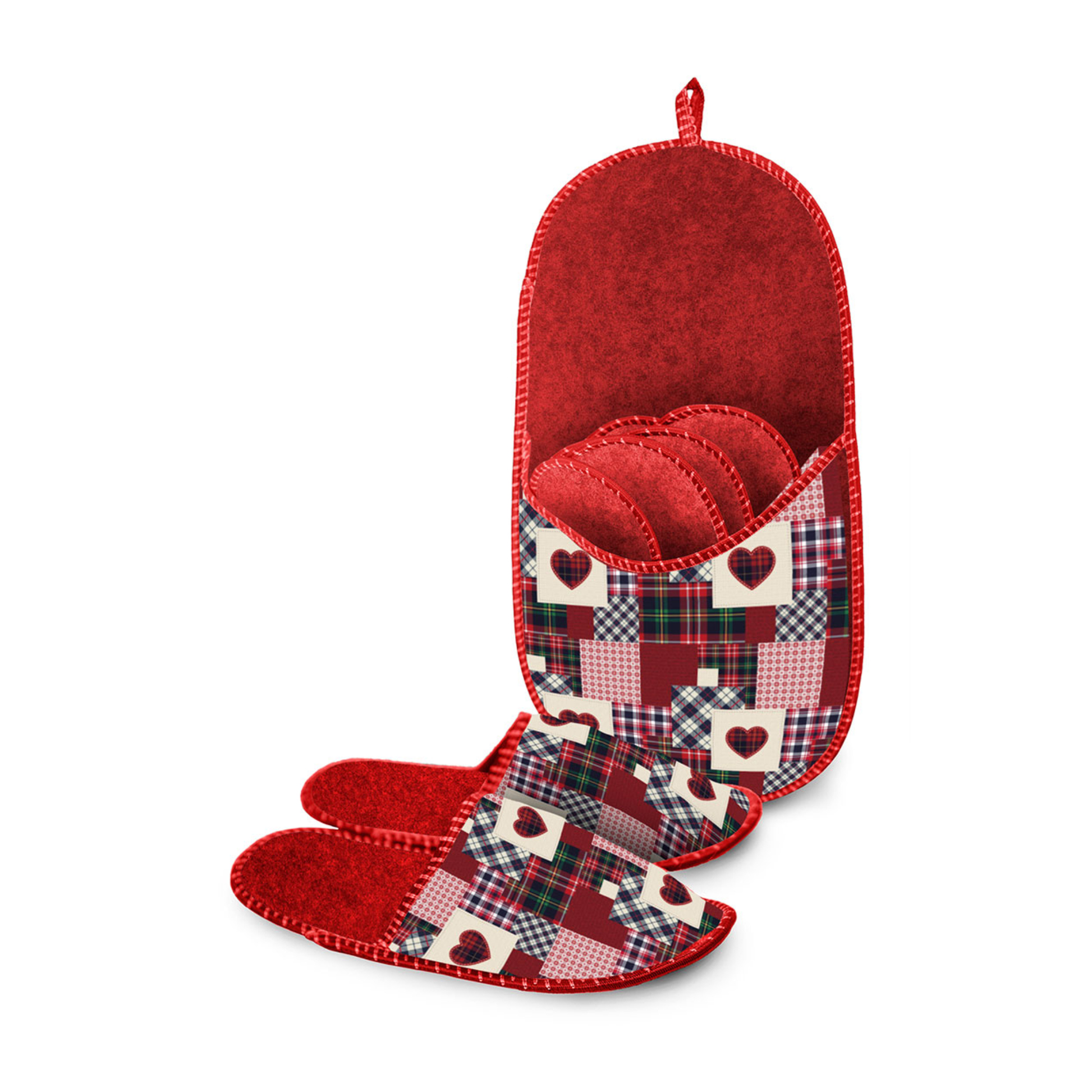 Realizzate in feltro sintetico 100% poliestere, le ciabatte risultano leggere, sottili e non imbottite, perfette per un utilizzo occasionale. La stampa digitale Saint Veran, caratterizzata da motivi tartan e cuori su fondo rosso, richiama lo stile tipico delle atmosfere alpine, rendendo questo set un elemento decorativo oltre che funzionale.