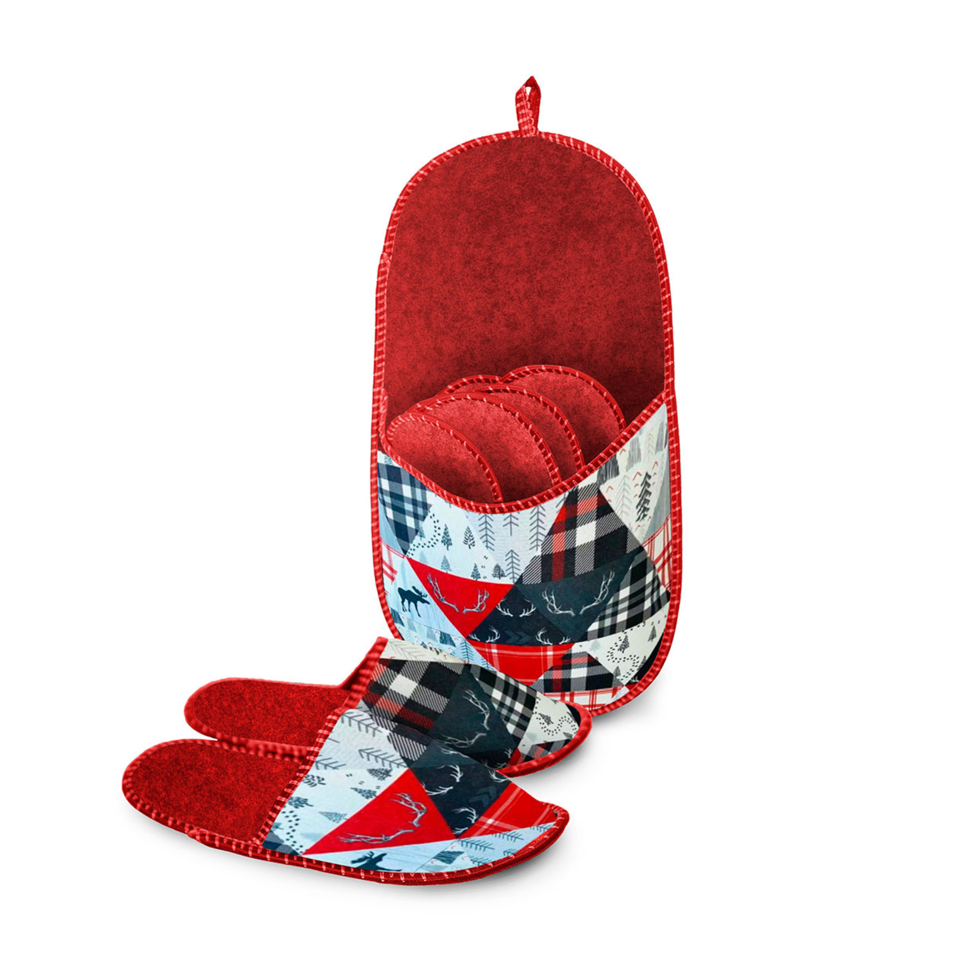Realizzate in feltro sintetico (100% poliestere), sono sottili, leggere e non imbottite, quindi pratiche da riporre e sempre pronte all’uso. La fantasia Tovel, con motivi montani su fondo rosso, aggiunge un tocco caldo e accogliente, perfetto per chi ama l’atmosfera tipica delle case di montagna.