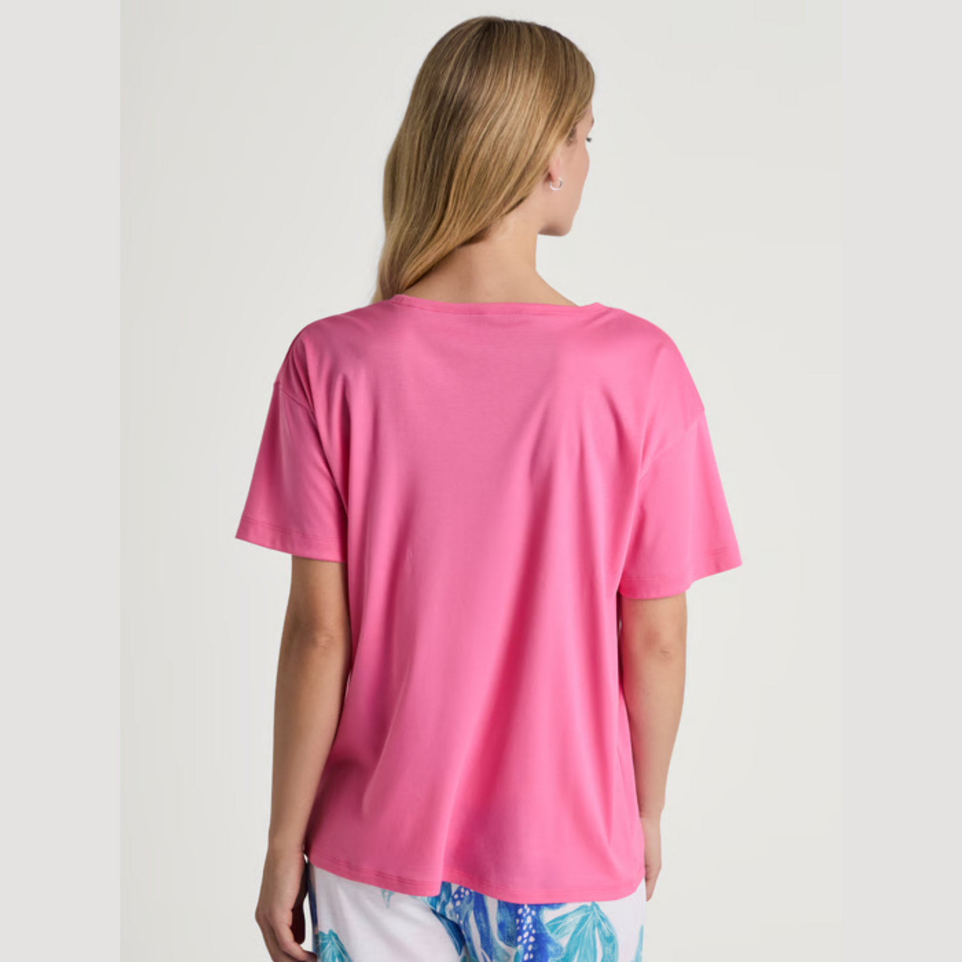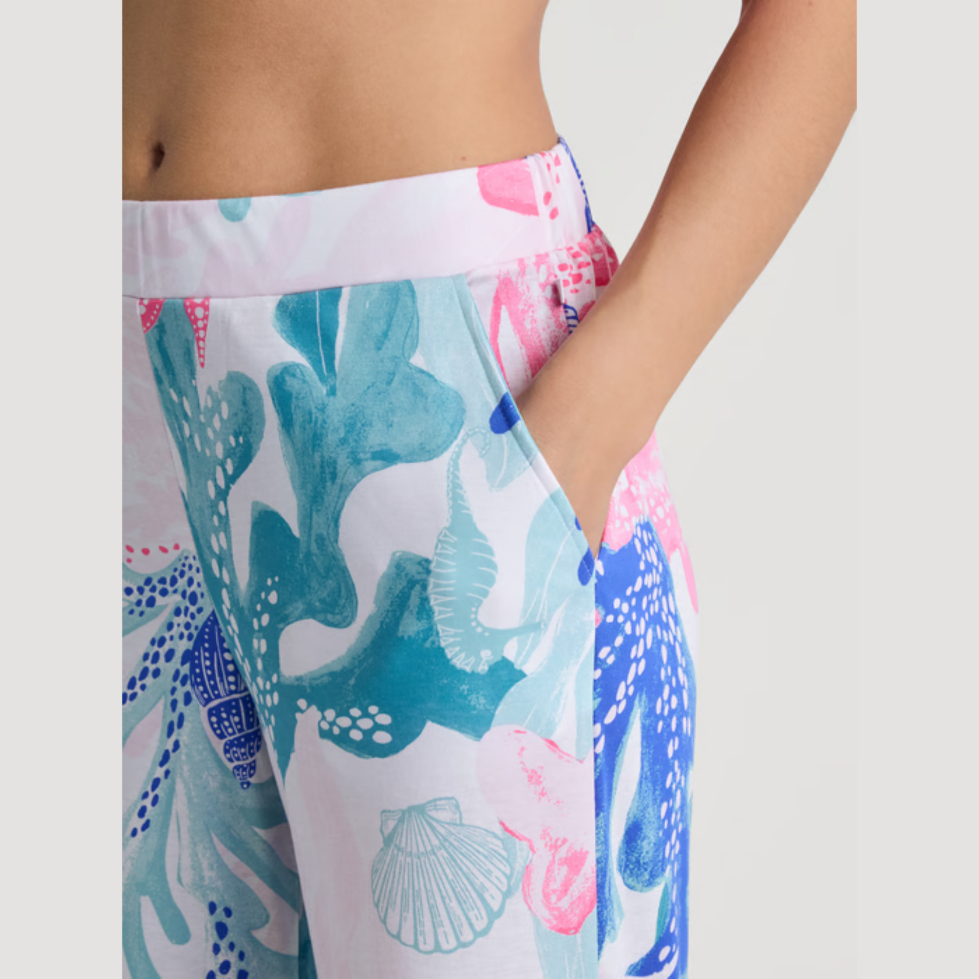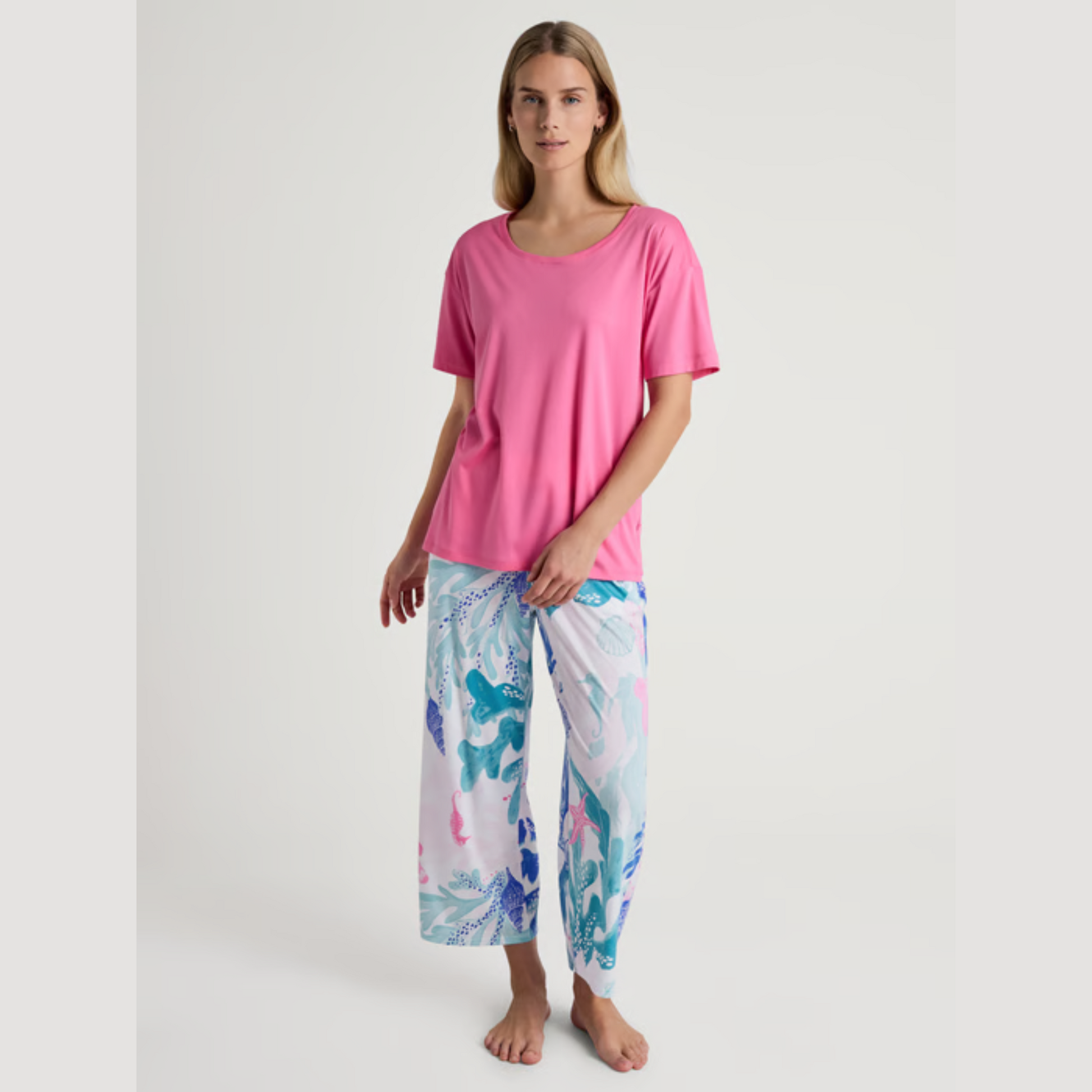 Il completo donna CALIDA FAVOURITES COAST unisce comfort e leggerezza in un design estivo e raffinato. Composto da una T-shirt rosa tinta unita e da un pantalone dritto 7/8 con delicata stampa marina in rosa garofano, è perfetto da indossare in casa o nel tempo libero durante la bella stagione.