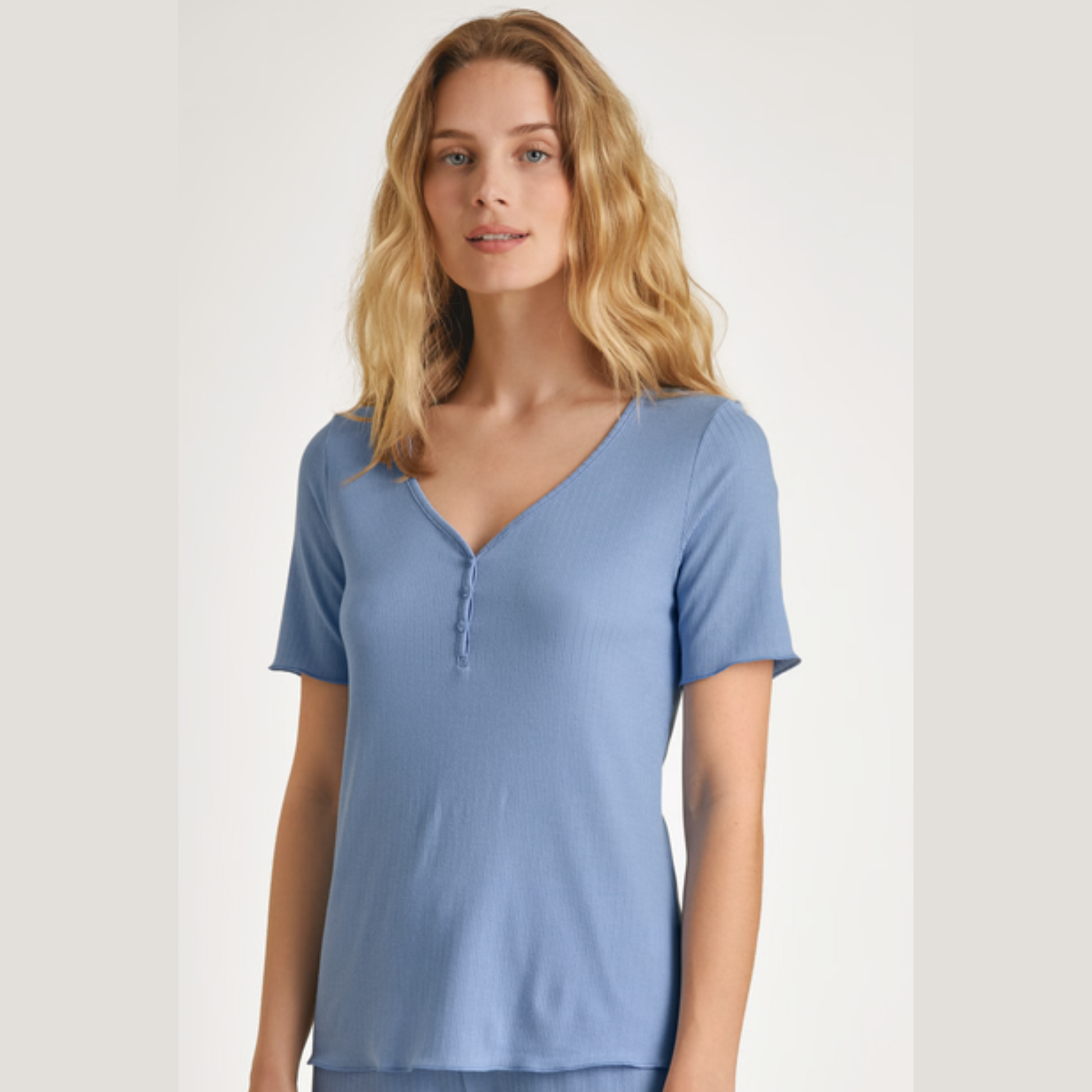 Il completo della serie FAVOURITES HARMONY di CALIDA ha un effetto rilassante e risulta morbido e fluido a contatto con la pelle grazie al pregiato mix di cotone e TENCEL™ Modal. L’elegante orlo ondulato alle estremità e lo scollo a V con abbottonatura la rendono perfetta da indossare.