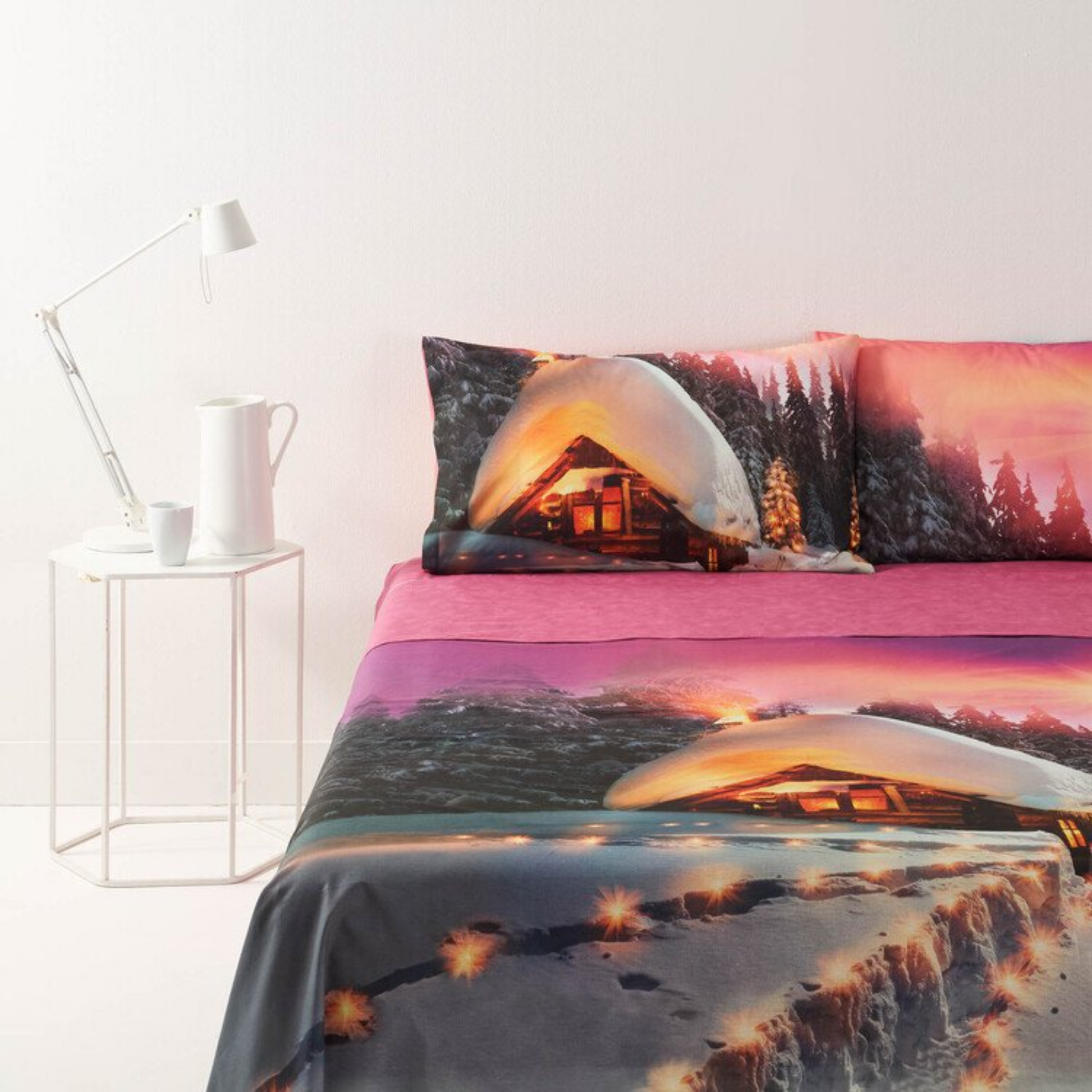 - Design: Raffigurazione di una baita immersa nella neve, illuminata da piccole luci e avvolta in un cielo dai toni del rosa, che evoca il fascino dei paesaggi nordici.