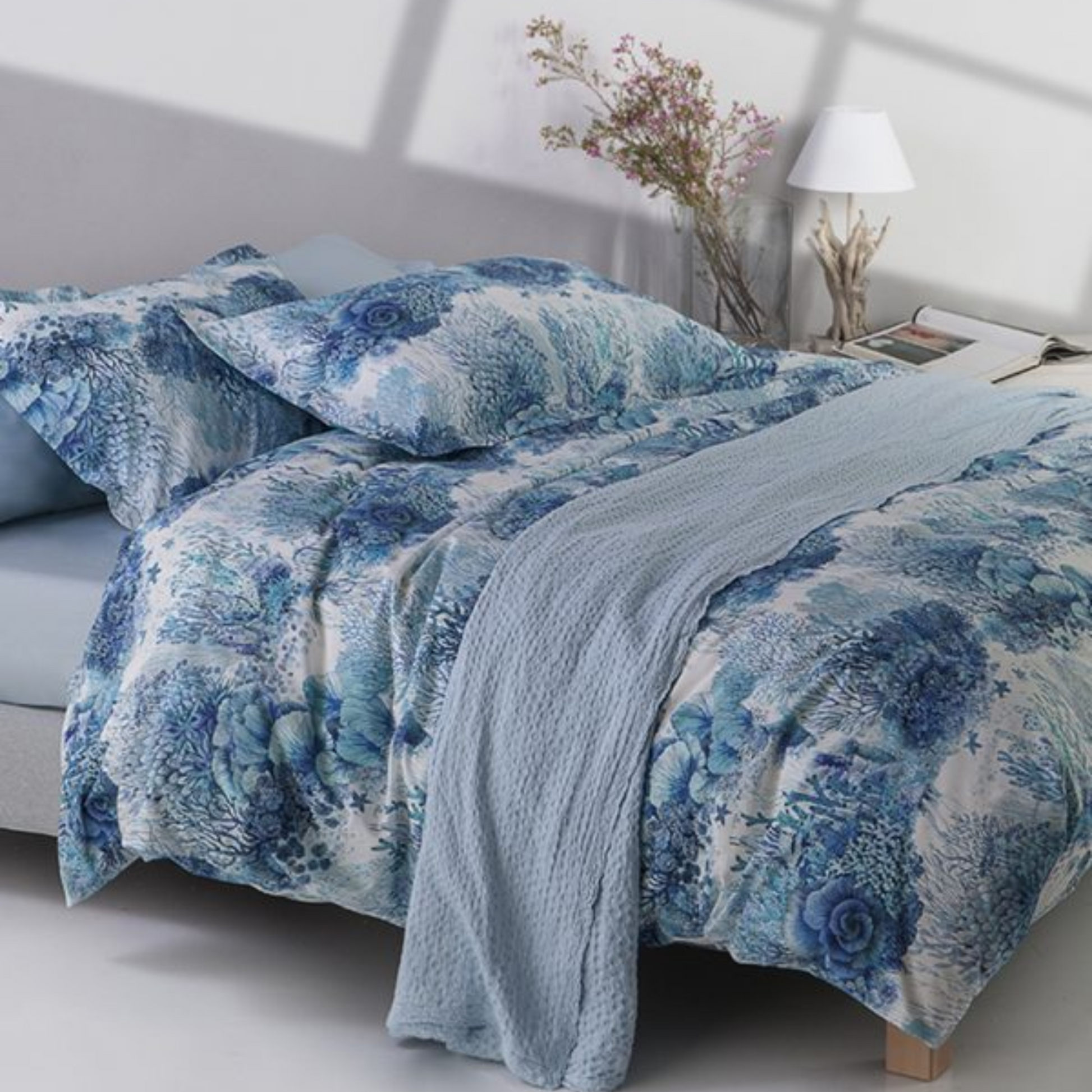 Immergiti nell’atmosfera estiva con il completo lenzuola matrimoniale Mirabello Carrara Sharm, disponibile in due vivaci varianti colore: rosso corallo e bluette oceano. Una stampa ricca e suggestiva che rappresenta un intreccio di coralli colorati, perfetta per dare un tocco marino ed elegante alla camera da letto.