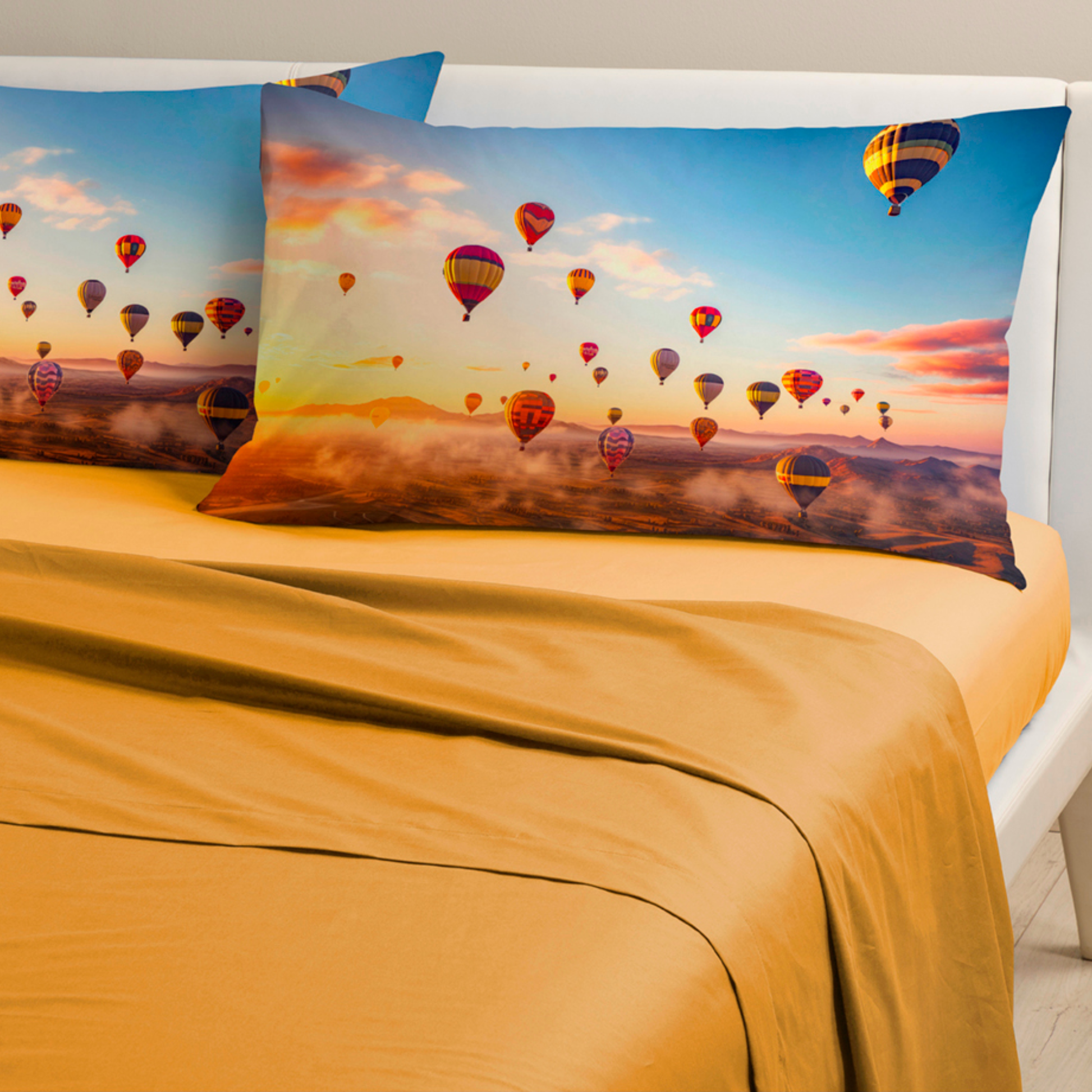 Il lenzuolo sopra è in tinta unita giallo scuro, mentre il lenzuolo sotto con angoli è in giallo chiaro, perfettamente coordinati con la federa in fantasia Mongolfiera stampata in alta qualità digitale per un effetto vivido e duraturo.