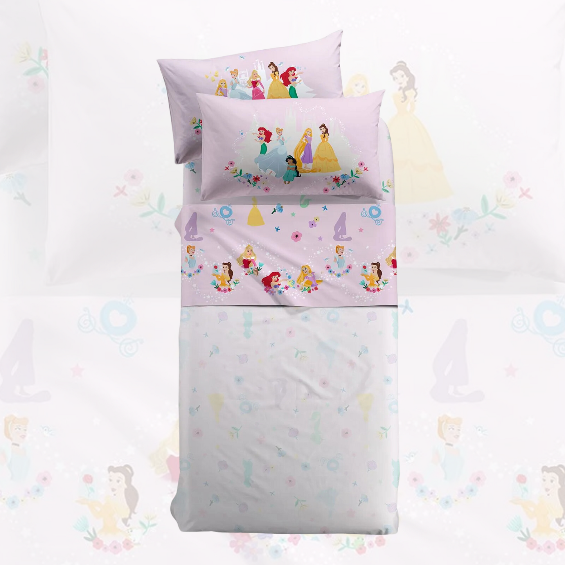 Porta l'incanto delle principesse Disney nella cameretta della tua bambina con il completo lenzuola "Princess Flowers Disney" di Caleffi.