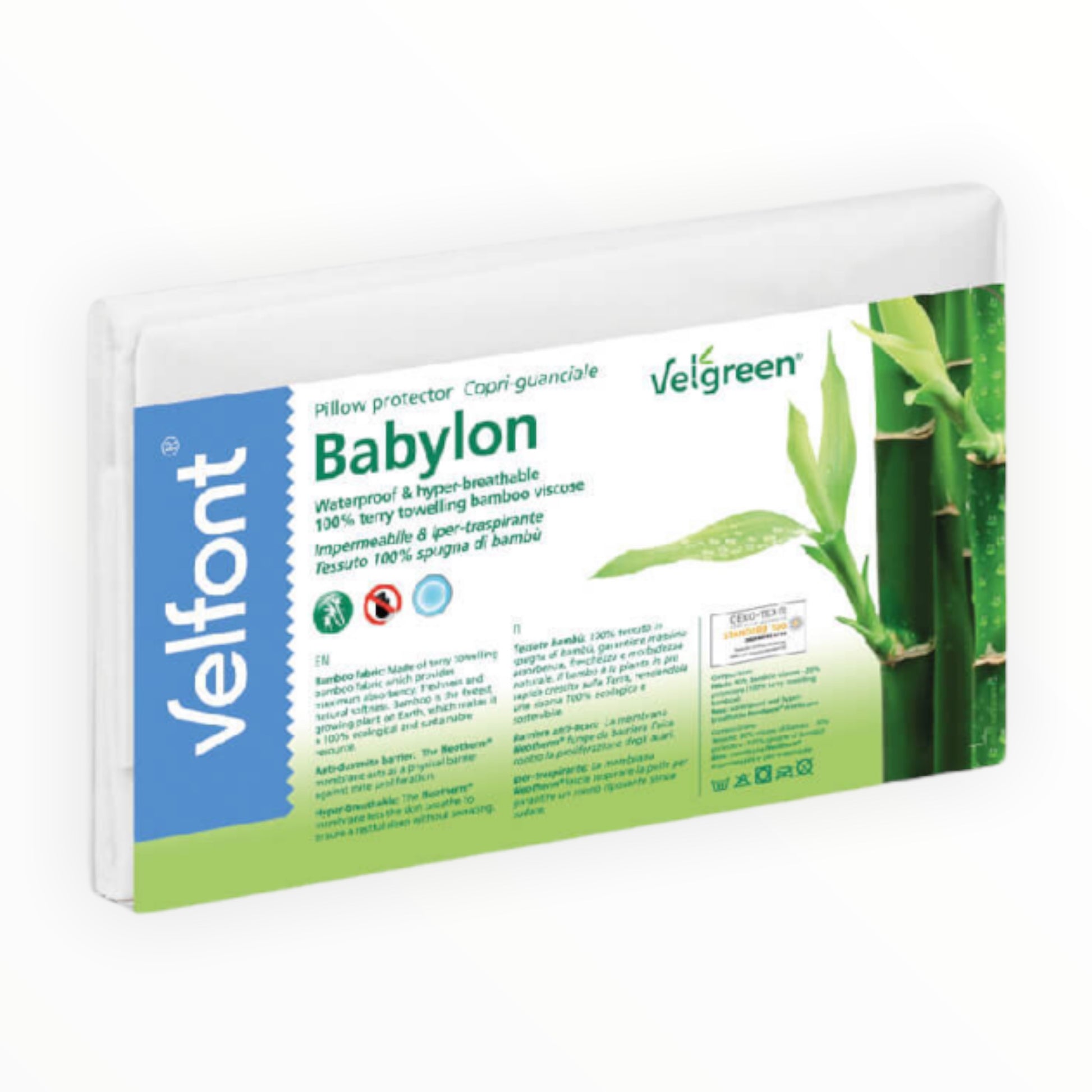 Il proteggi guanciale Velfont Impermeabile e Iper-traspirante è realizzato al 100% in spugna di bambù, garantendo la massima assorbenza, morbidezza e freschezza.