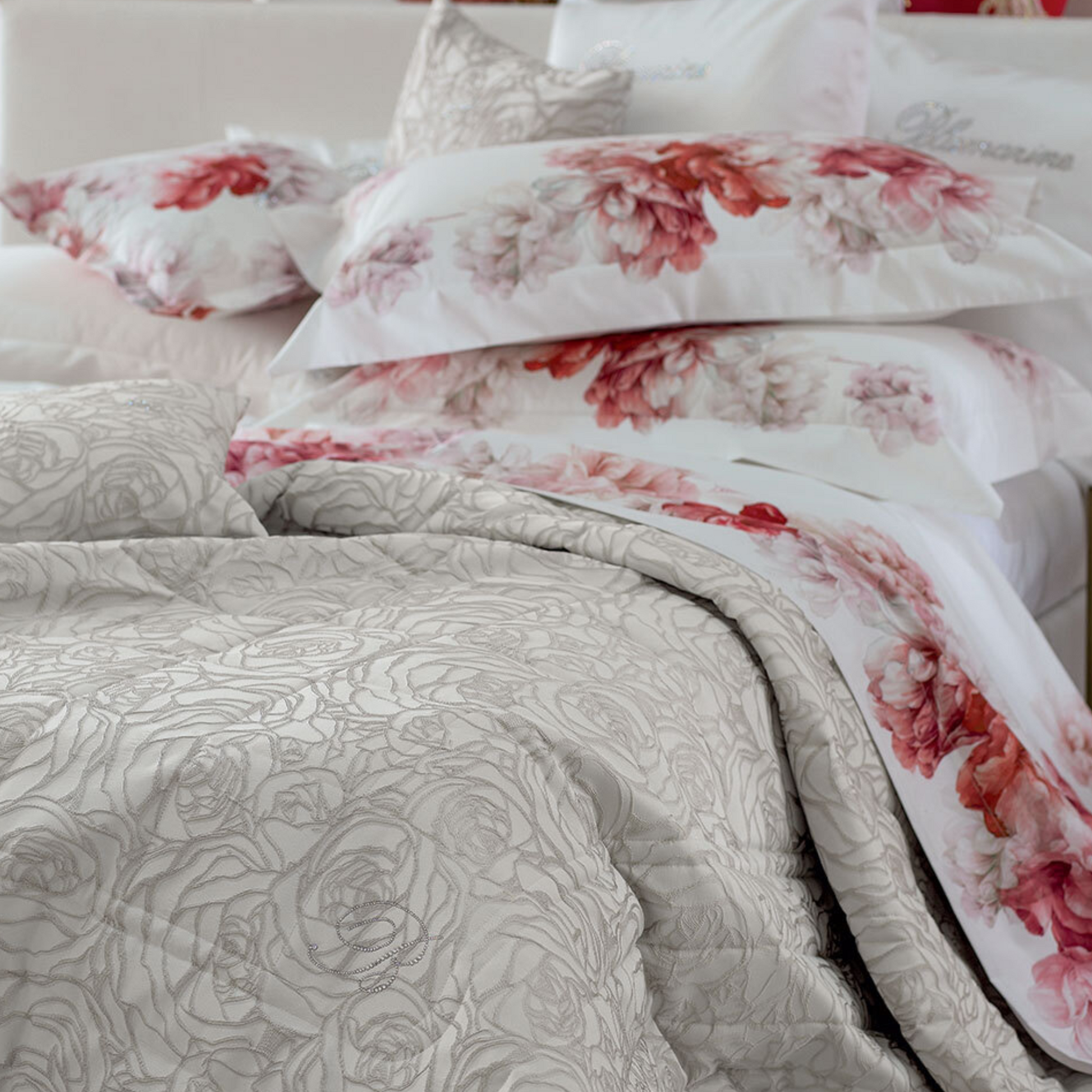 Il copriletto Dalida di Blumarine è un'elegante aggiunta alla tua camera da letto, offrendo non solo comfort ma anche stile. Realizzato in jacquard di alta qualità, questo copriletto matrimoniale porta con sé il prestigioso logo Blumarine arricchito da cristalli.