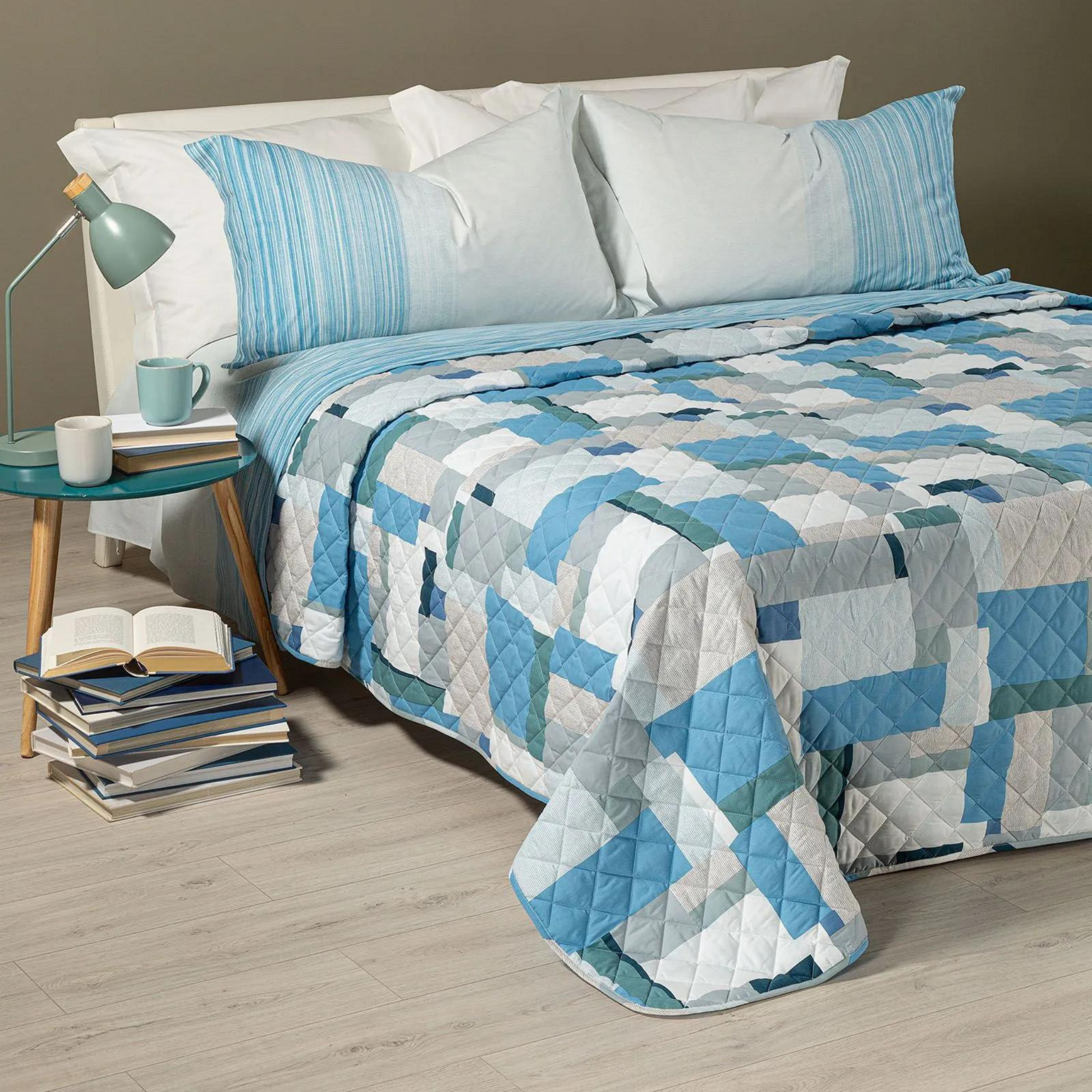 Creato per offrire una combinazione di eleganza e praticità, il copriletto Atlantic presenta un disegno geometrico sui toni rilassanti di azzurro, bianco e grigio, perfette per trasformare la tua camera da letto in uno spazio accogliente e di tendenza.