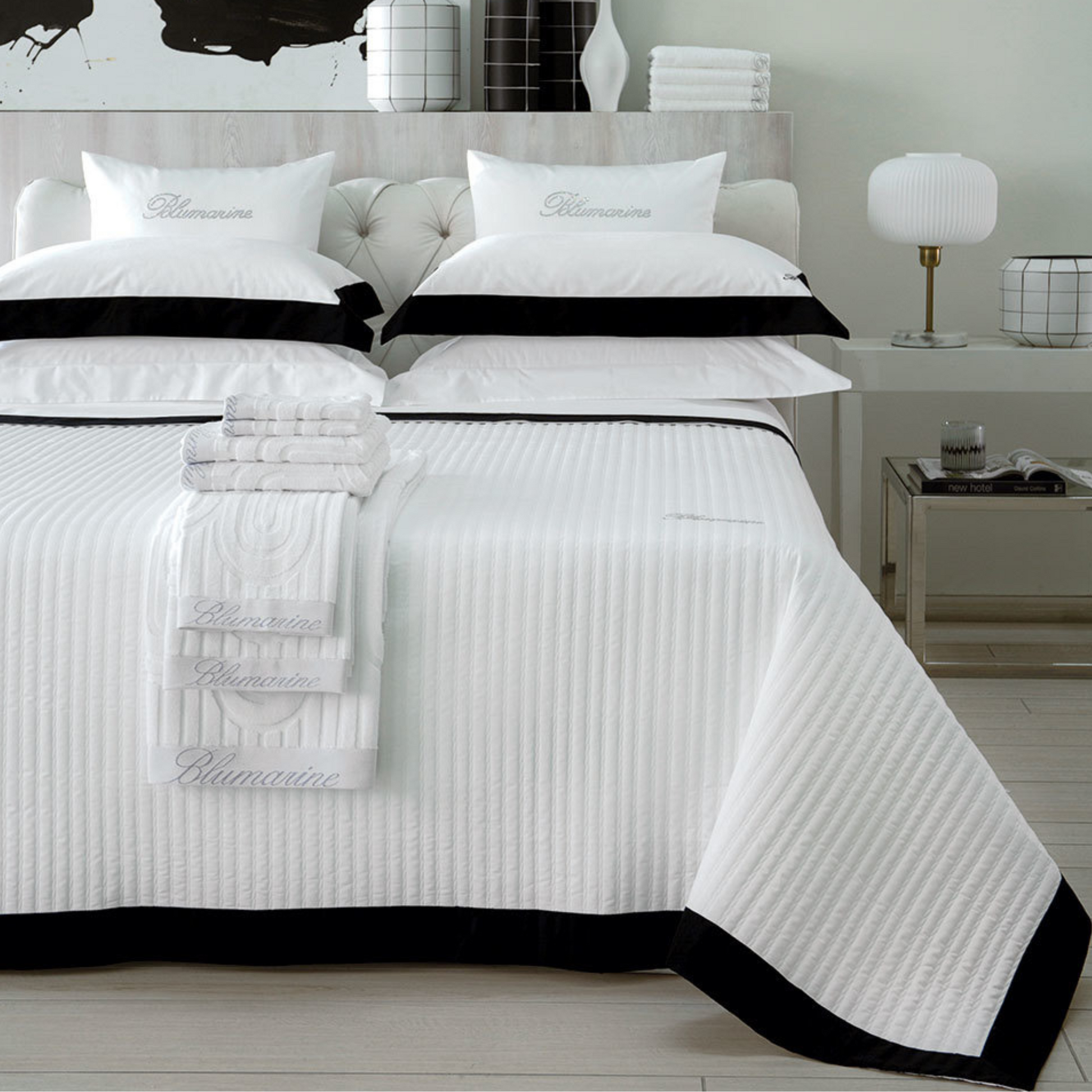 Copriletto matrimoniale trapuntato in raso tinta unita con bordo in contrasto rimesso in applicazione sui tre lati e monogramma B ricamato.