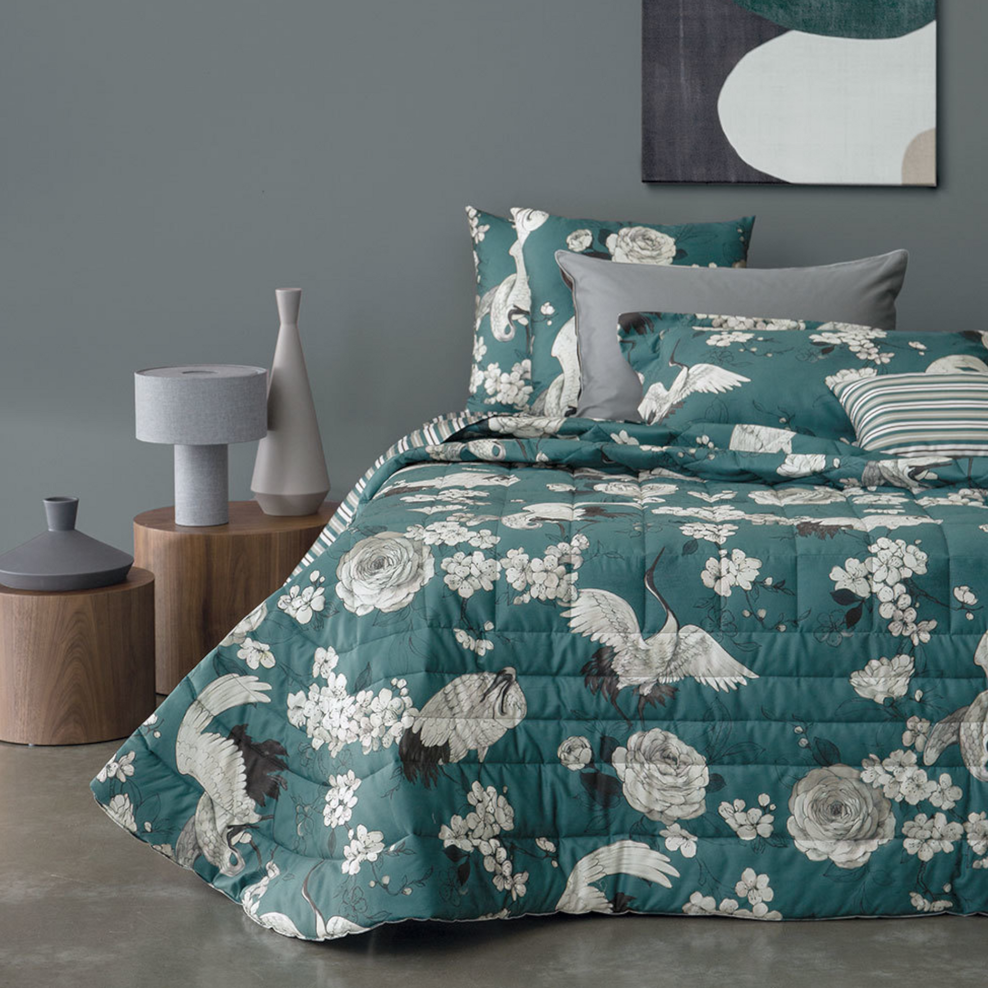 Copriletto trapuntato matrimoniale in raso di cotone stampato con delicato motivo orientale su fondo colorato. Il fascino dell'oriente.
