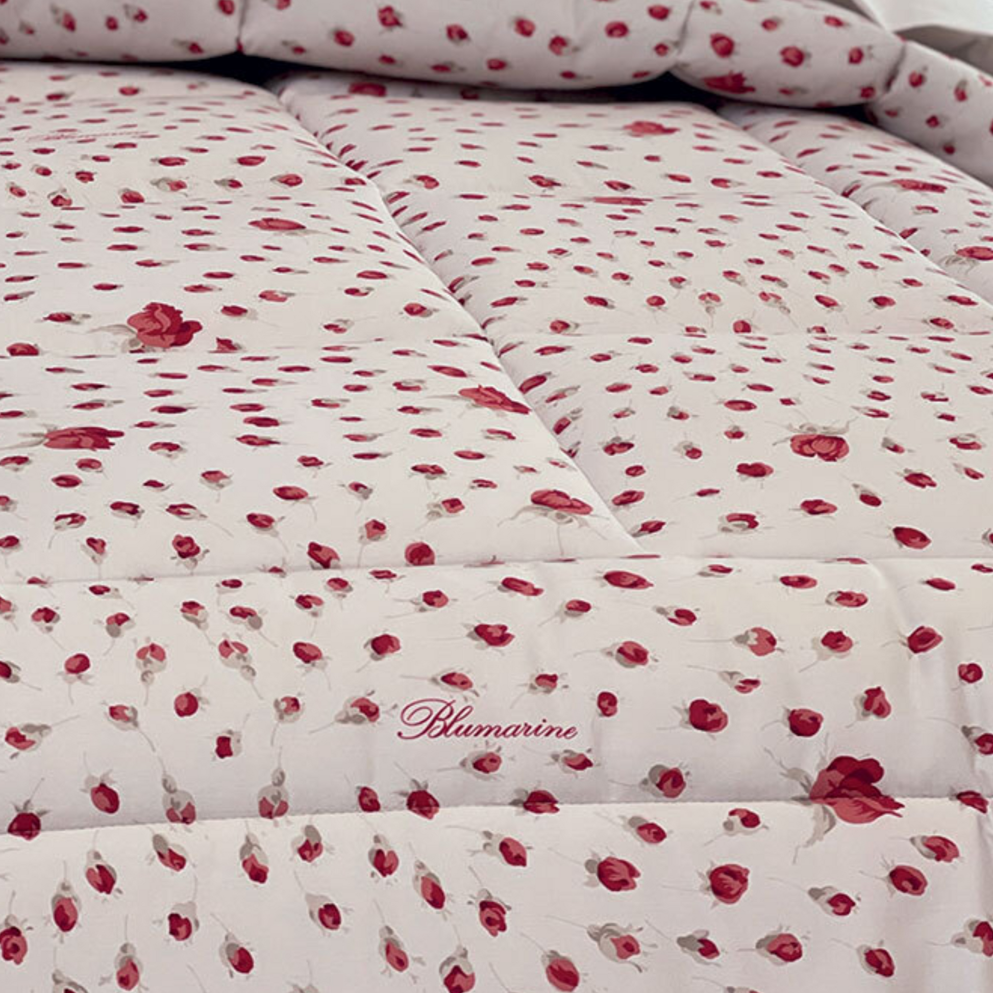 Il copriletto presenta il logo Blumarine stampato nella trama per un dettaglio esclusivo. L’imbottitura leggera da 90 g/m² garantisce comfort e versatilità, ideale per le mezze stagioni.