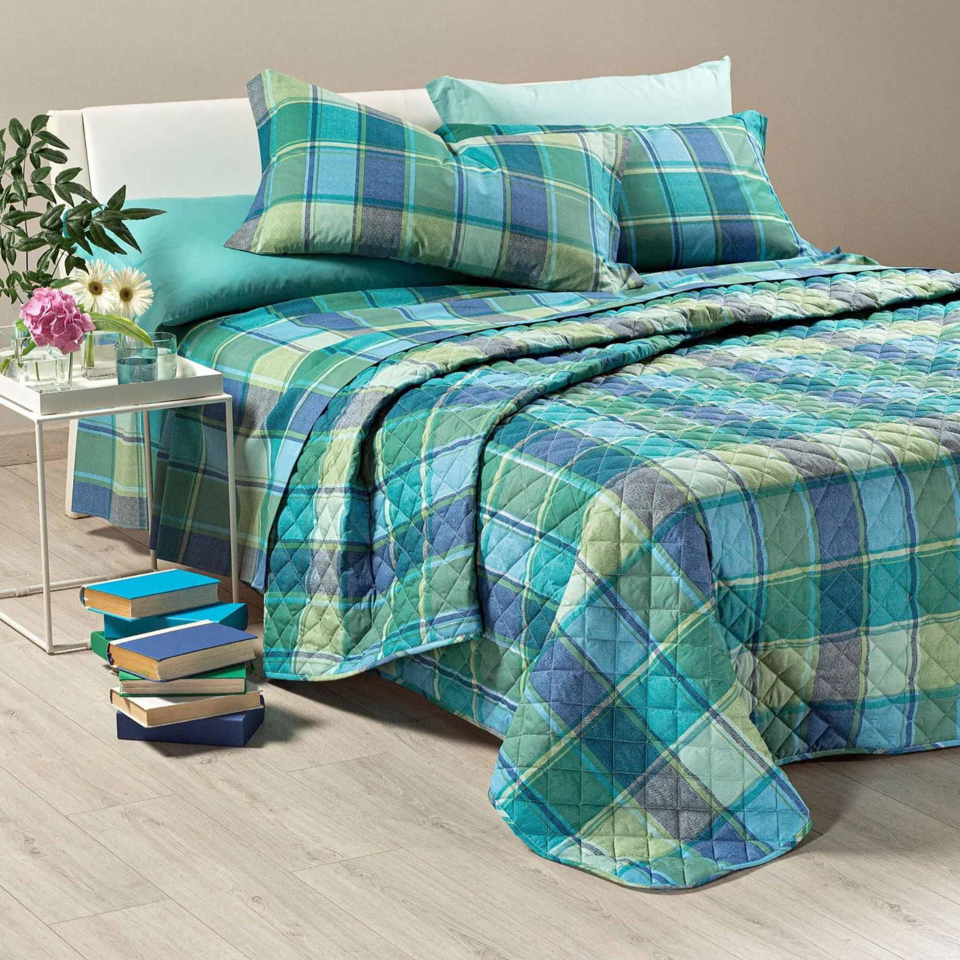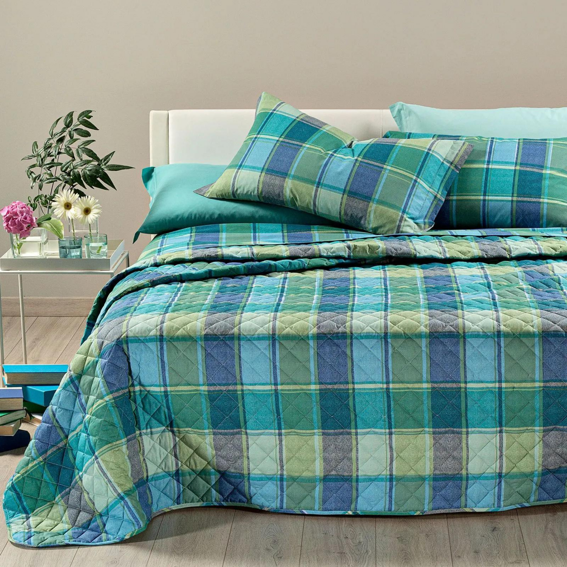 Creato per offrire una combinazione di eleganza e praticità, il copriletto Tex presenta un disegno geometrico sui toni rilassanti di azzurro, blu e verde, perfette per trasformare la tua camera da letto in uno spazio accogliente e di tendenza.