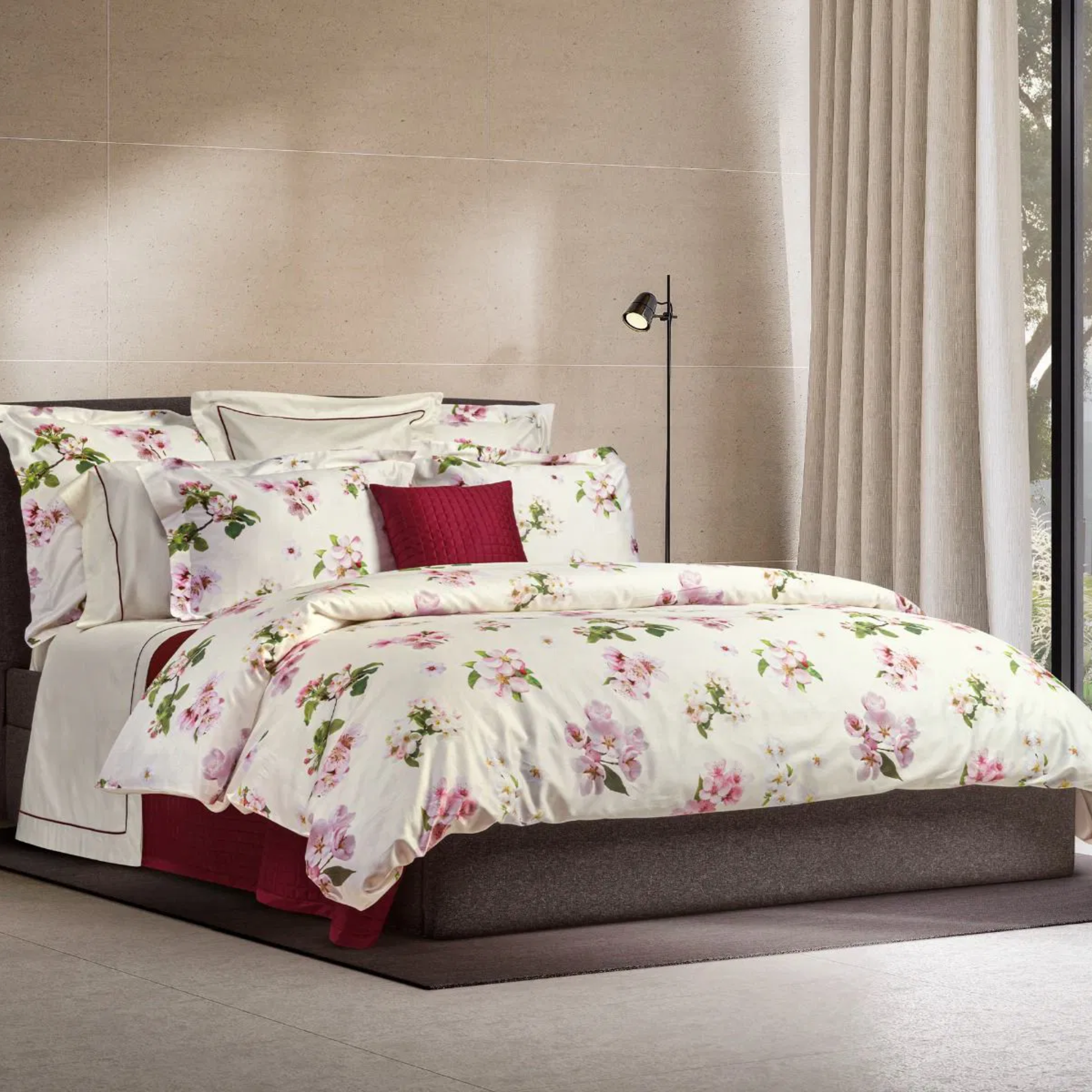 Nel rispetto della più autentica tradizione artigianale italiana, la parure copripiumino Ciliegio di Signoria di Firenze celebra la bellezza effimera e poetica della fioritura dei ciliegi giapponesi. Il disegno, delicato ed elegante, si sviluppa su una raffinata palette panna e rosa, evocando leggerezza, armonia e un senso di quiete naturale.