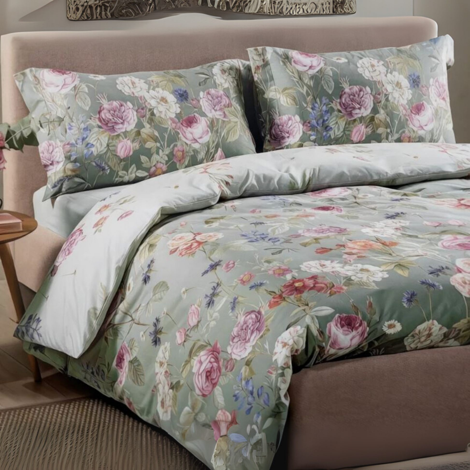 La Parure Copripiumino Giardino Romantico di Caleffi è realizzata in 100% cotone pettinato di alta qualità, morbido e traspirante, ideale per garantire un sonno rigenerante. Il design floreale dal gusto romantico, in tonalità giada (verde), porta freschezza ed eleganza nella tua camera da letto, creando un ambiente accogliente e raffinato.