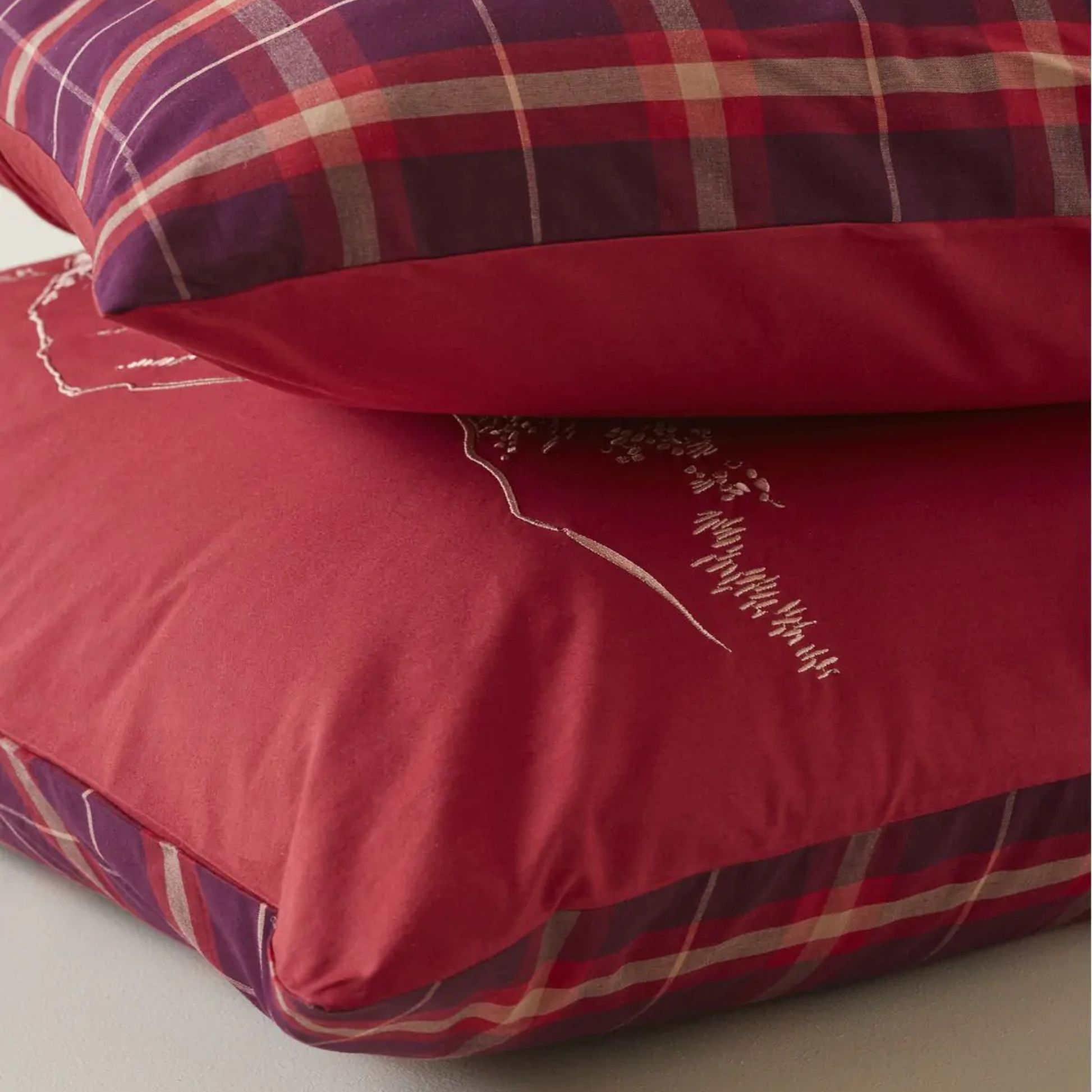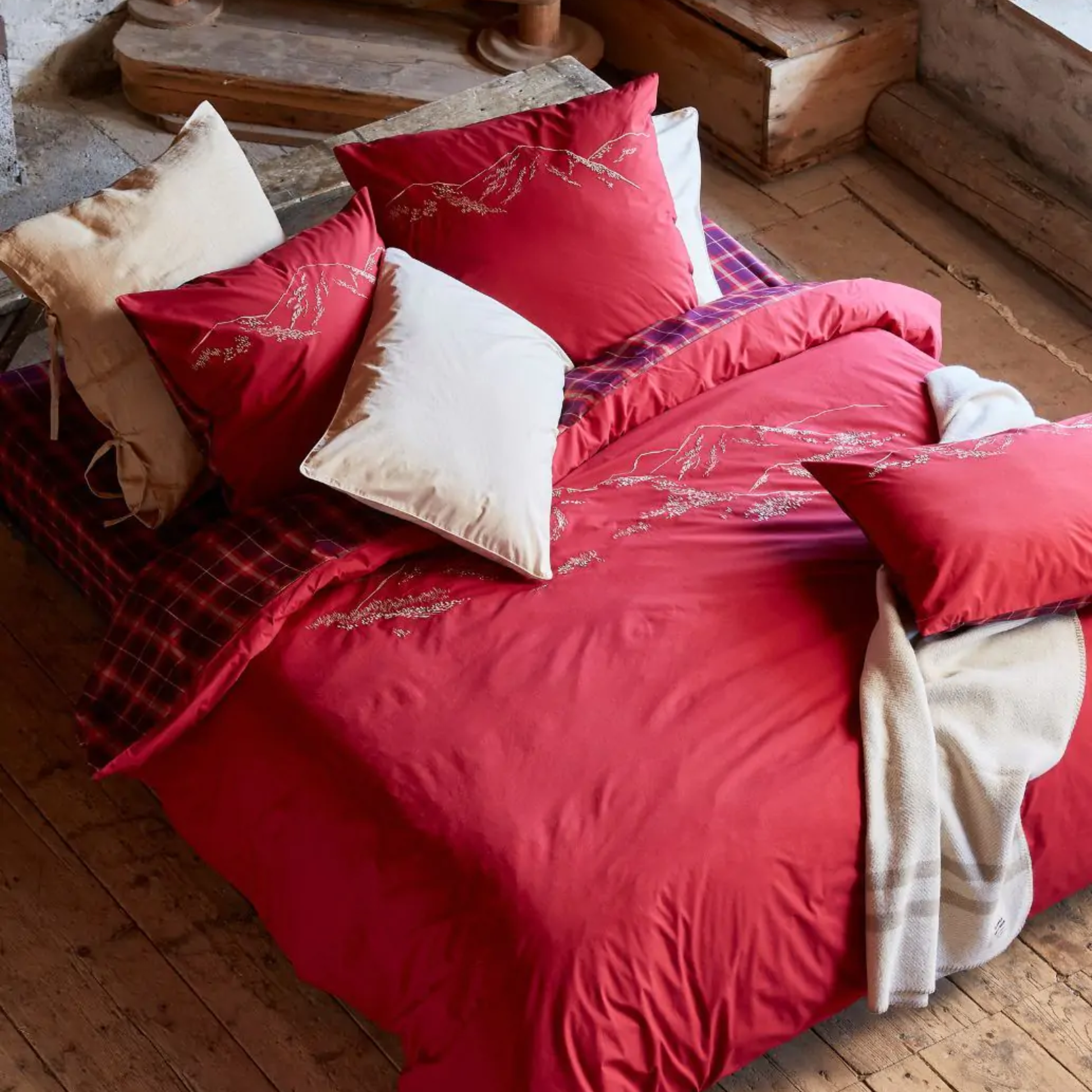 La palette cromatica è studiata per trasmettere comfort e carattere: un rosso intenso e avvolgente dialoga con delicate sfumature di beige rosato e prugna, creando un insieme elegante e armonioso. Sul retro, il motivo a quadri, reinterpretato in tessuto tinto in filo, richiama la tradizione con uno stile moderno e ricercato.