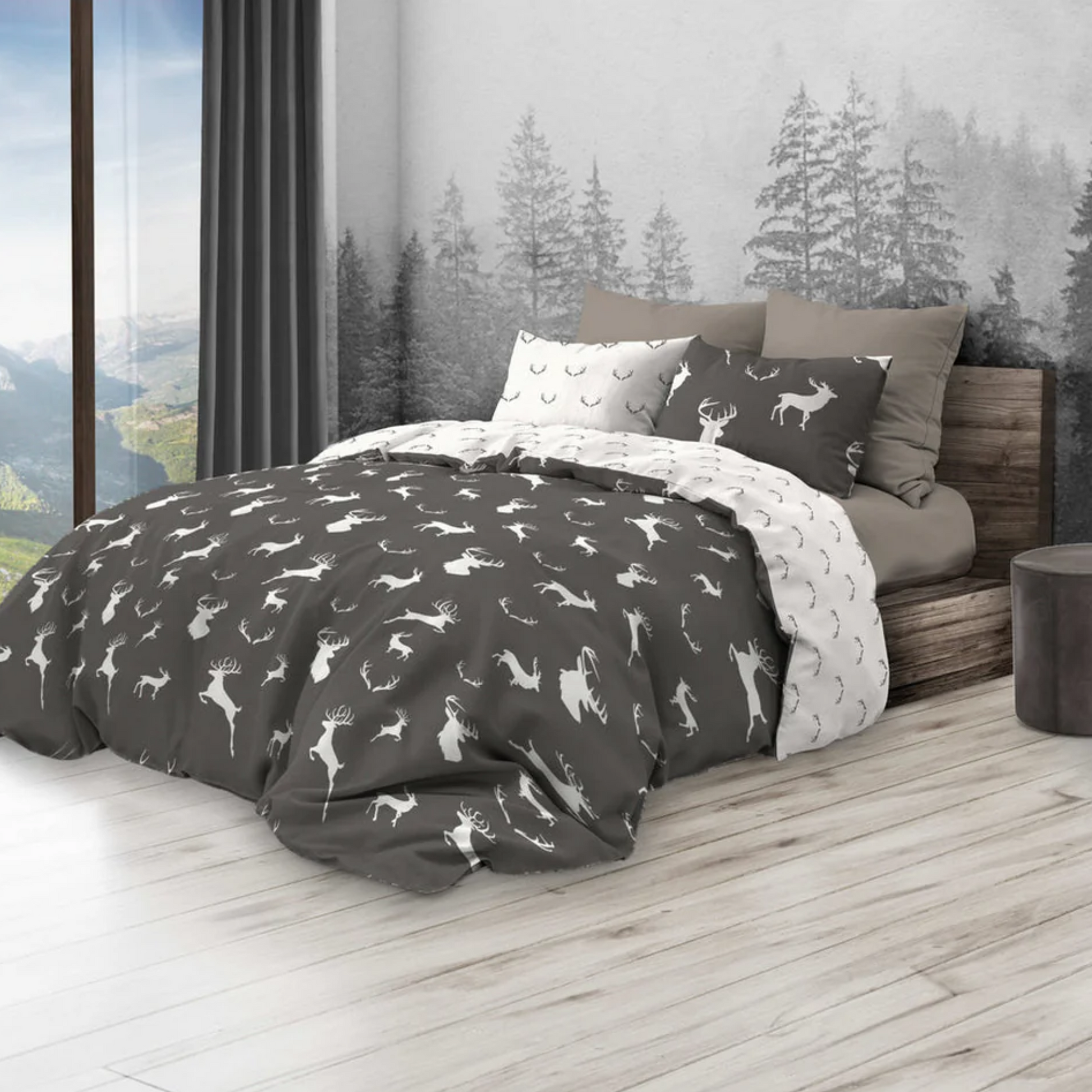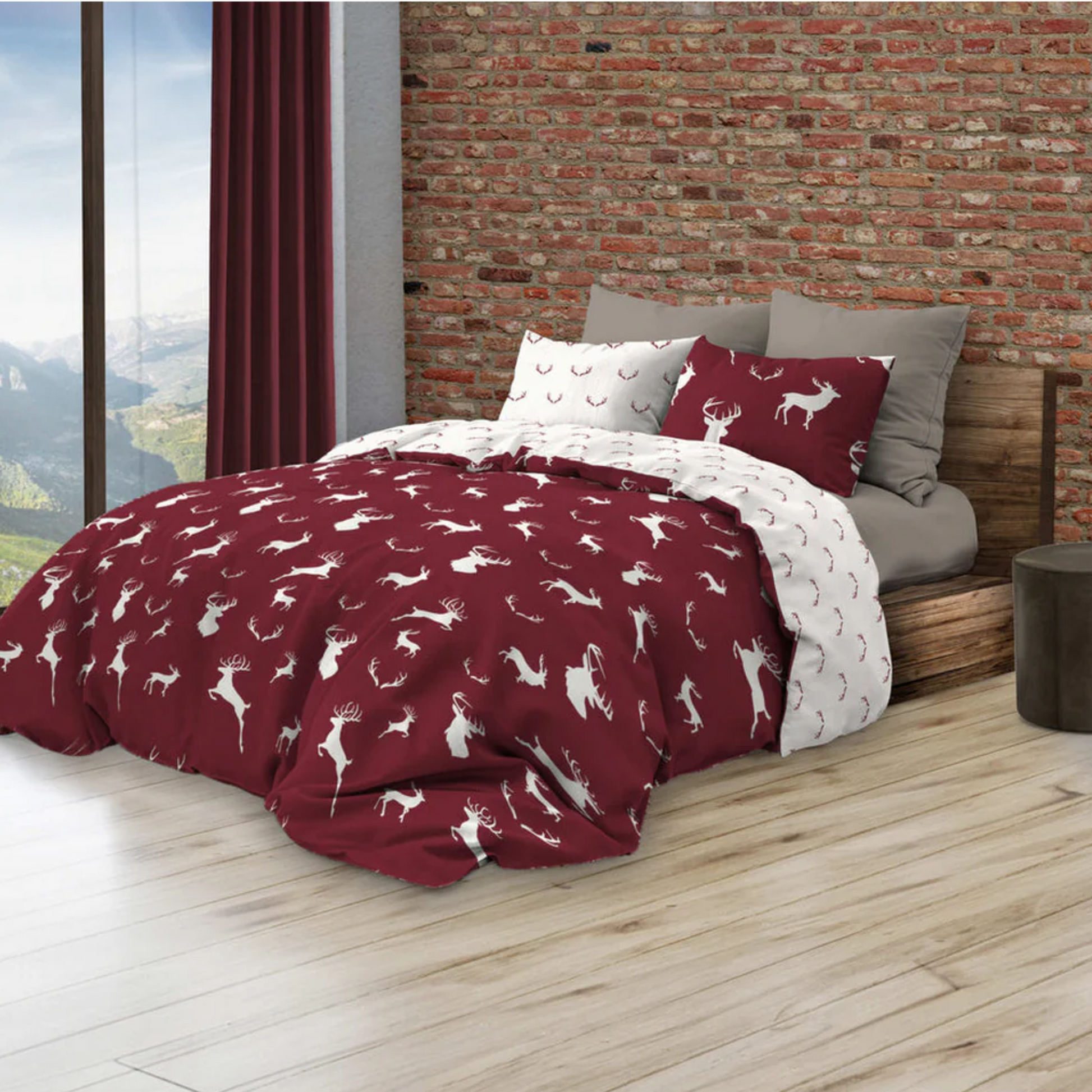 - Design Montano: Ispirato alla natura alpina, il copripiumino presenta raffinate immagini di cervi stilizzati su un fondo rosso, perfetto per chi ama lo stile rustico e accogliente.
