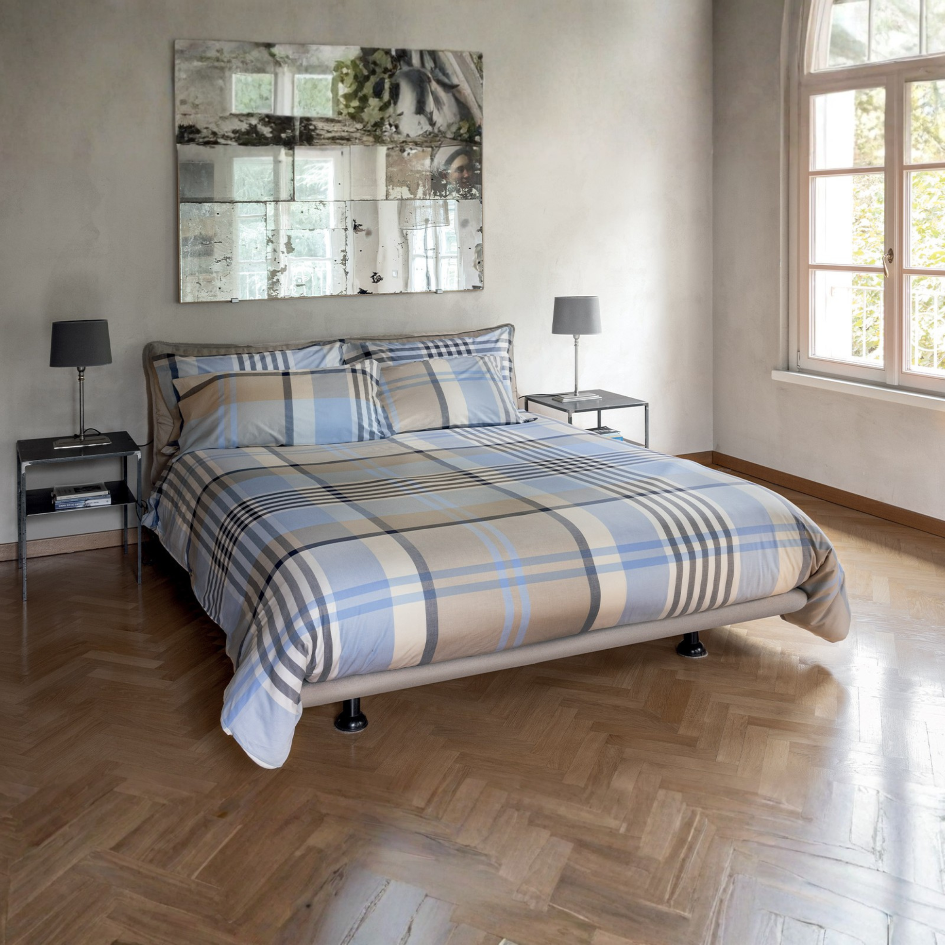 La parure copripiumino Lucan di Bossi Casa è realizzata in puro cotone pettinato 100% tinto in filo, espressione dell’eccellenza tessile che contraddistingue da sempre il marchio Bossi. La fantasia scozzese, proposta in una raffinata palette di toni azzurri e beige, dona alla camera da letto uno stile elegante, luminoso e senza tempo.
