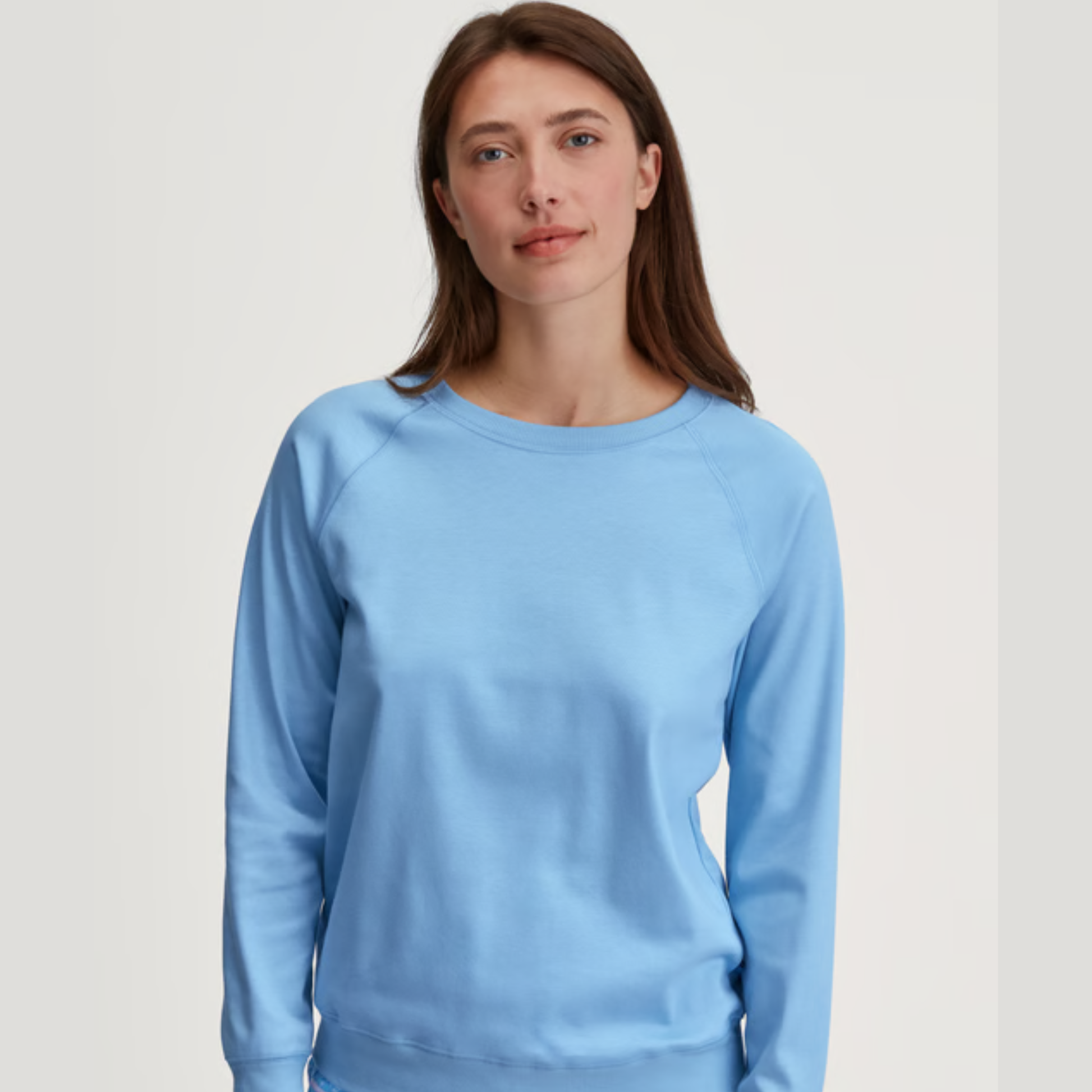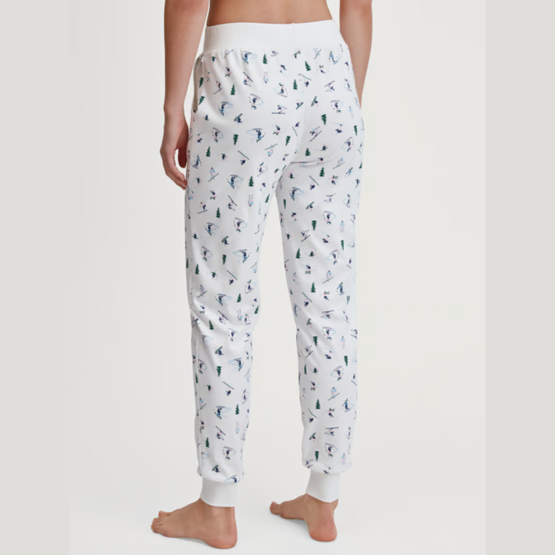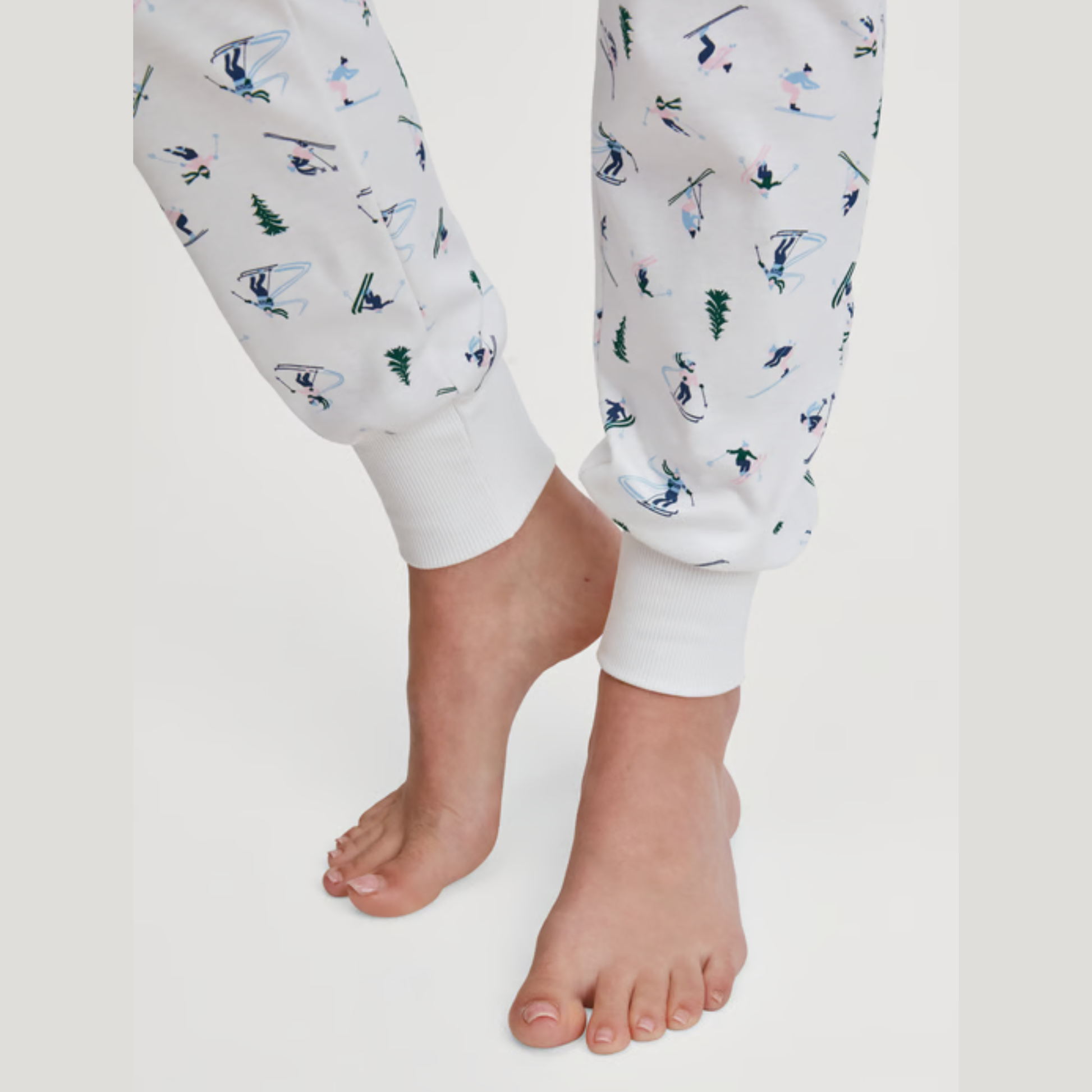 La maglia a tinta unita azzurro si abbina con eleganza ai pantaloni con fondo bianco, impreziositi da una stampa alpina discreta, che richiama il mondo della montagna con gusto sobrio e armonioso. I tagli classici, comodi e raffinati, assicurano una vestibilità confortevole e sempre attuale, mentre le finiture di qualità riflettono l’eccellenza del marchio Calida.