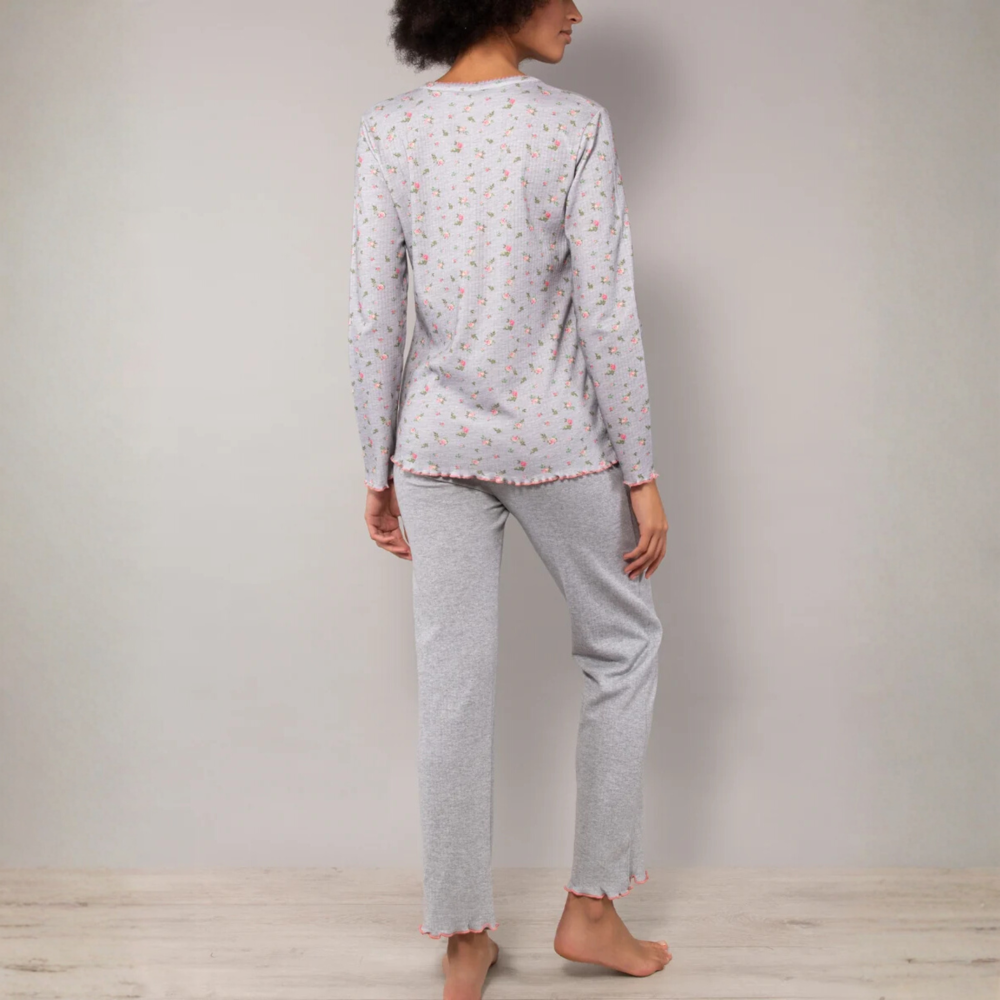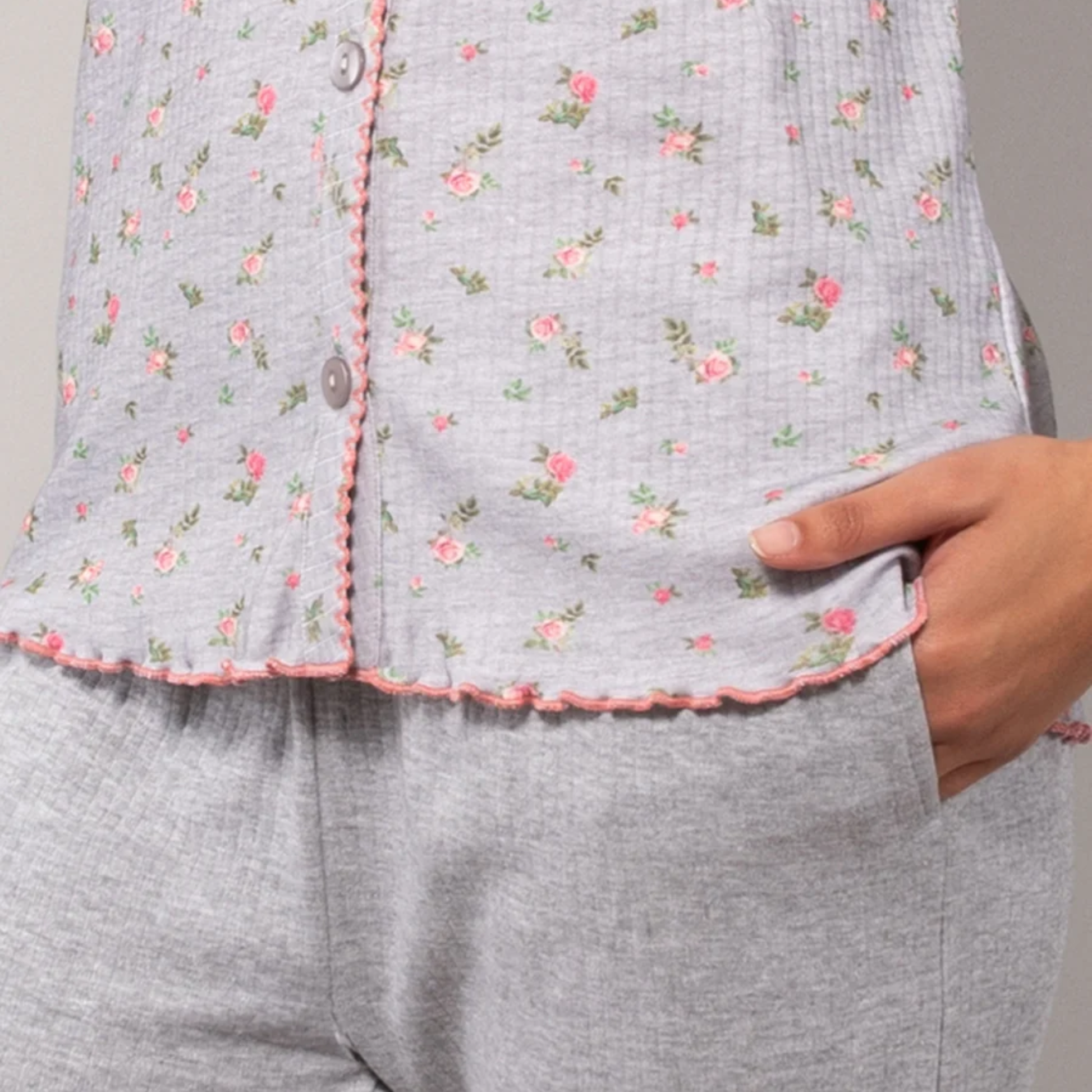 Il Pigiama Aperto A-HB13 di Verdissima conquista con il suo look romantico e la comodità del tessuto a costine. La maglia, con scollo a V e apertura frontale con bottoncini, è decorata da una delicata stampa a fiorellini e rifinita con eleganti bordini rosa.