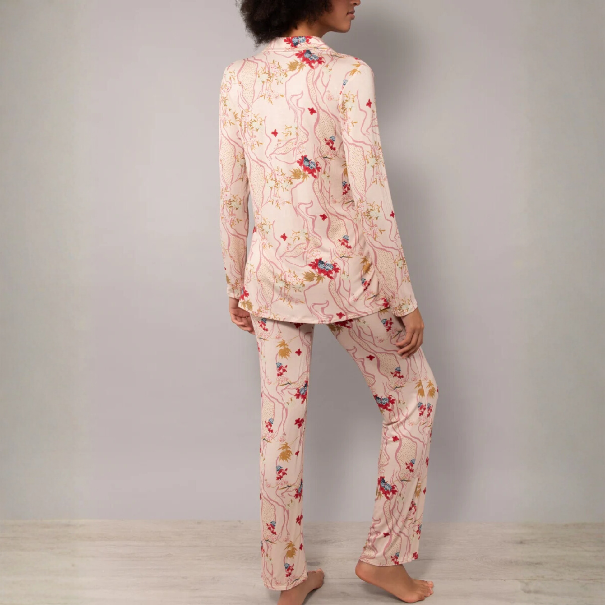 La maglia aperta con chiusura a bottoni presenta un colletto elegante che dona un tocco di stile senza tempo. Il fondo rosa con fiorellini colorati aggiunge dolcezza e romanticismo al design, perfettamente coordinato con il pantalone lungo abbinato, dotato di comode tasche laterali. Un completo ideale per le serate di relax, ma anche per chi ama un look raffinato anche a casa.
