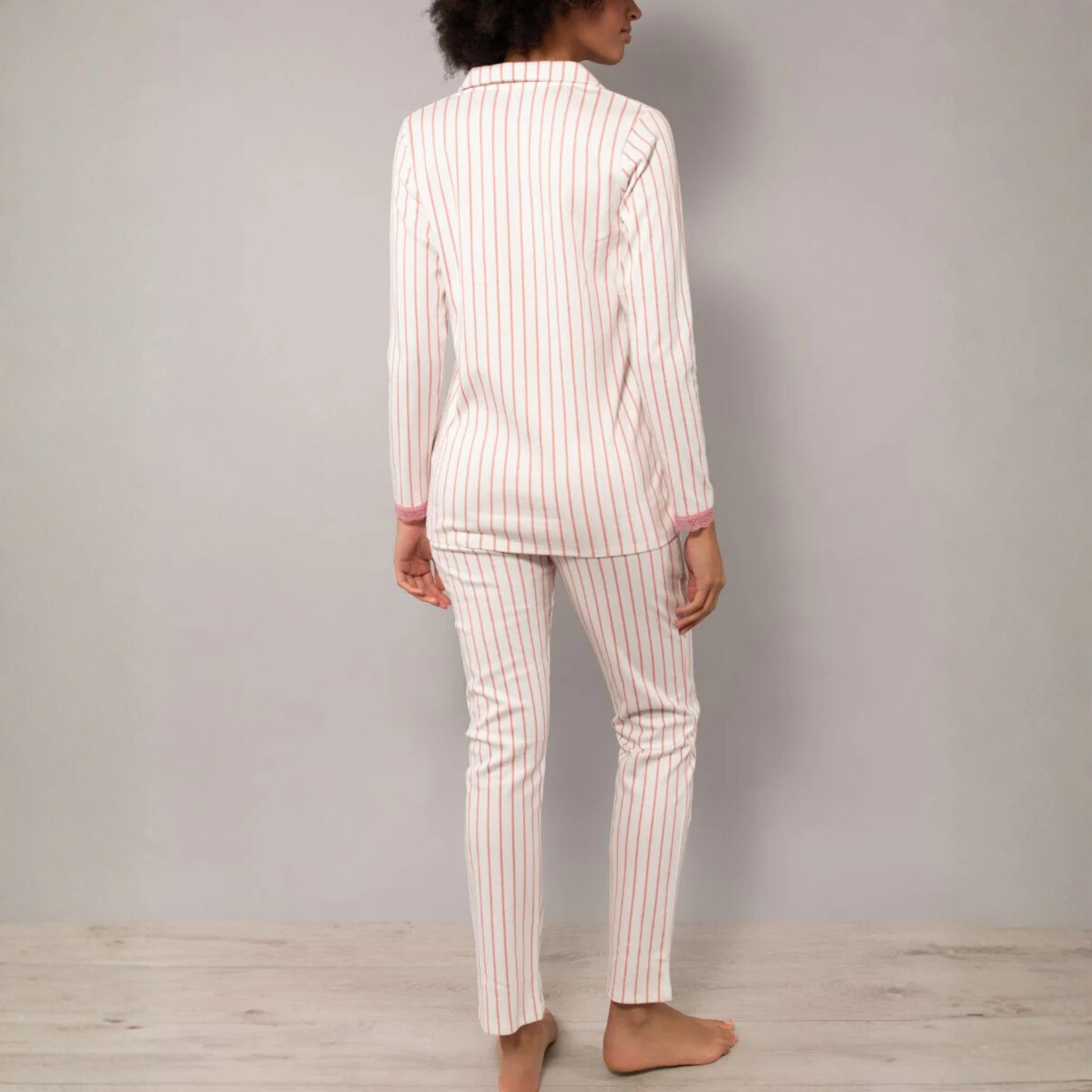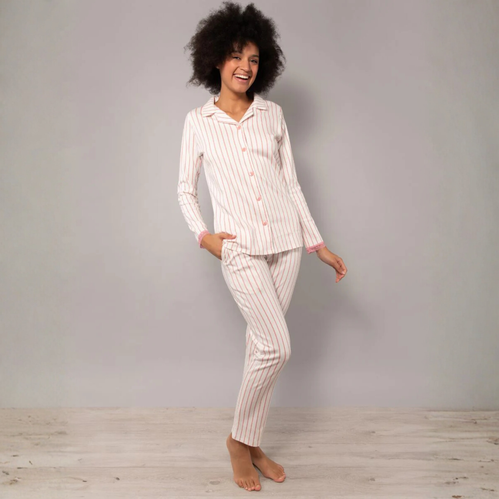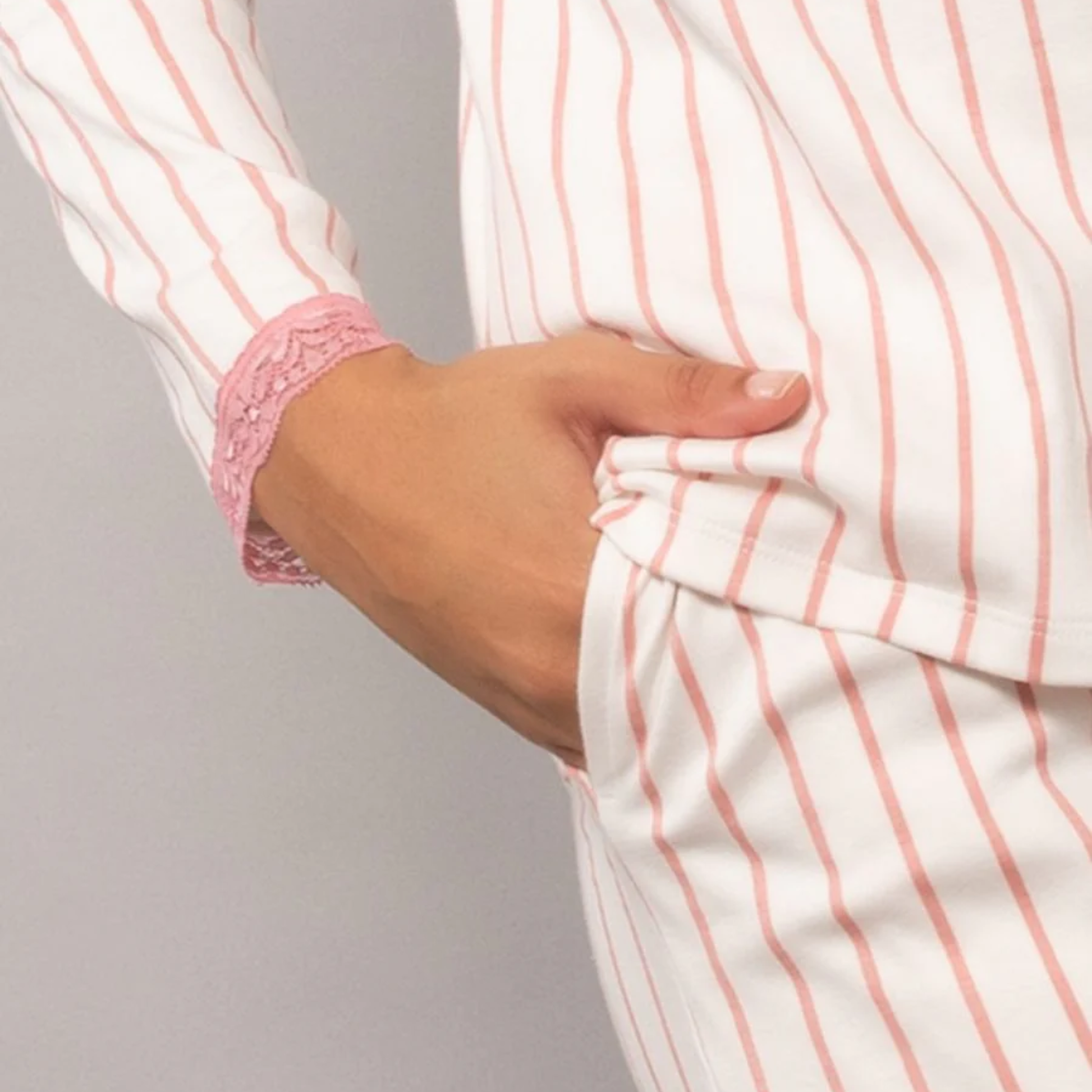 Il Pigiama Lungo Aperto TT13 di Verdissima abbina comfort, femminilità e dettagli curati, diventando il capo ideale per le serate di relax. Il top, con fondo color latte e righe rosa, presenta delicati bordini in pizzo sulle maniche e una chiusura frontale con bottoncini rosa che richiamano perfettamente la palette del pigiama.