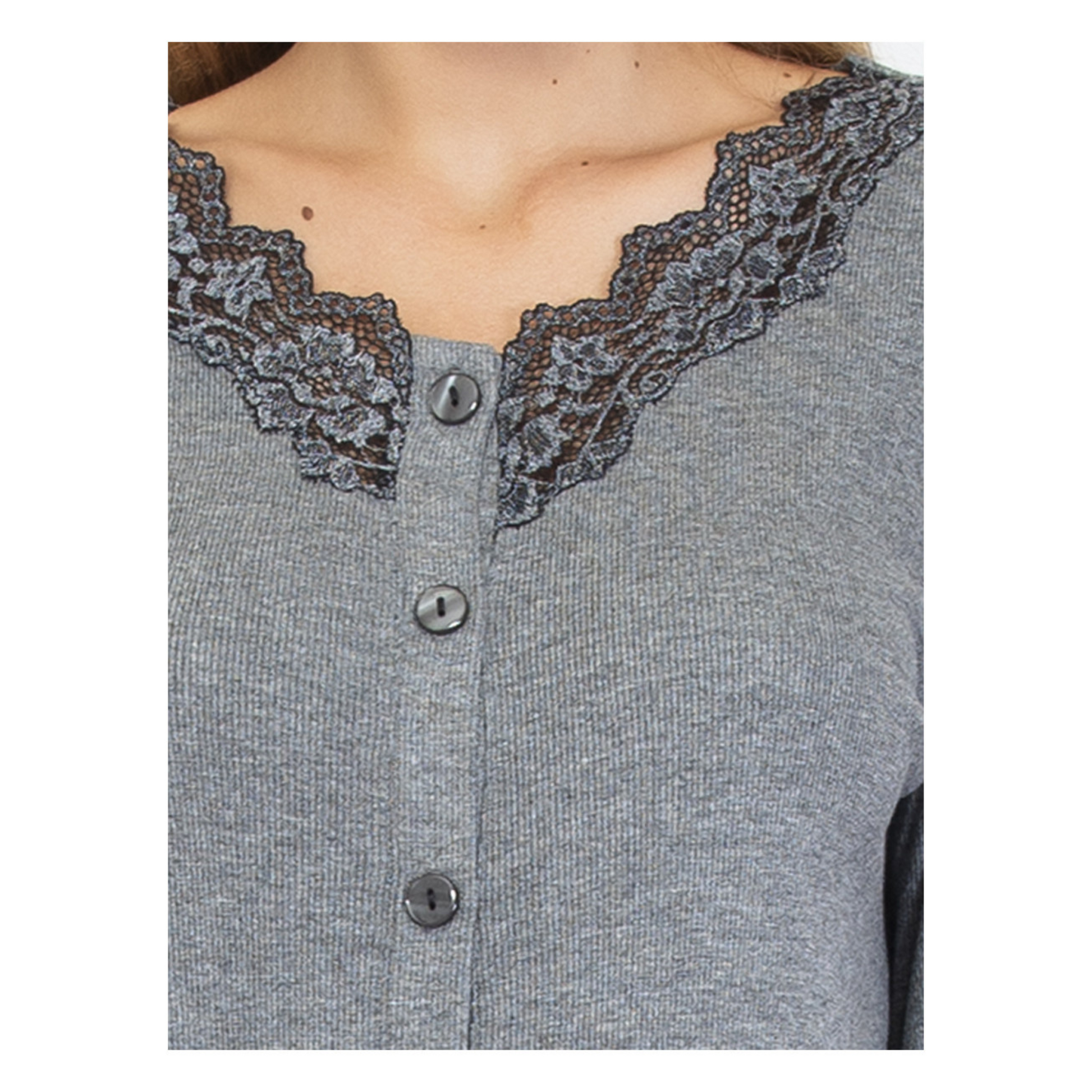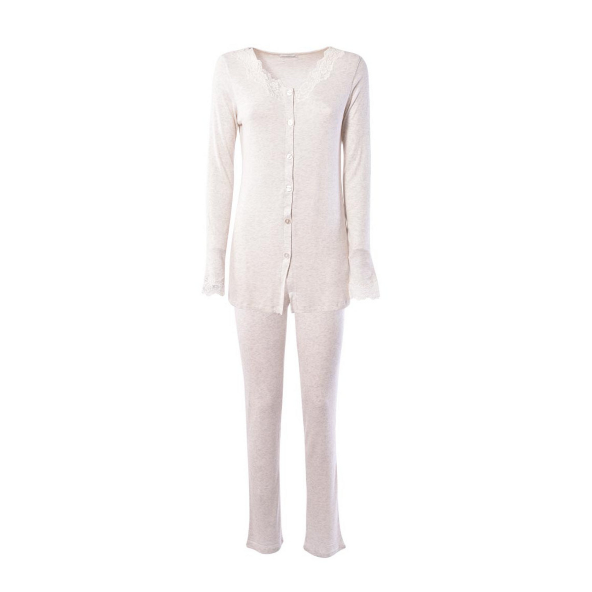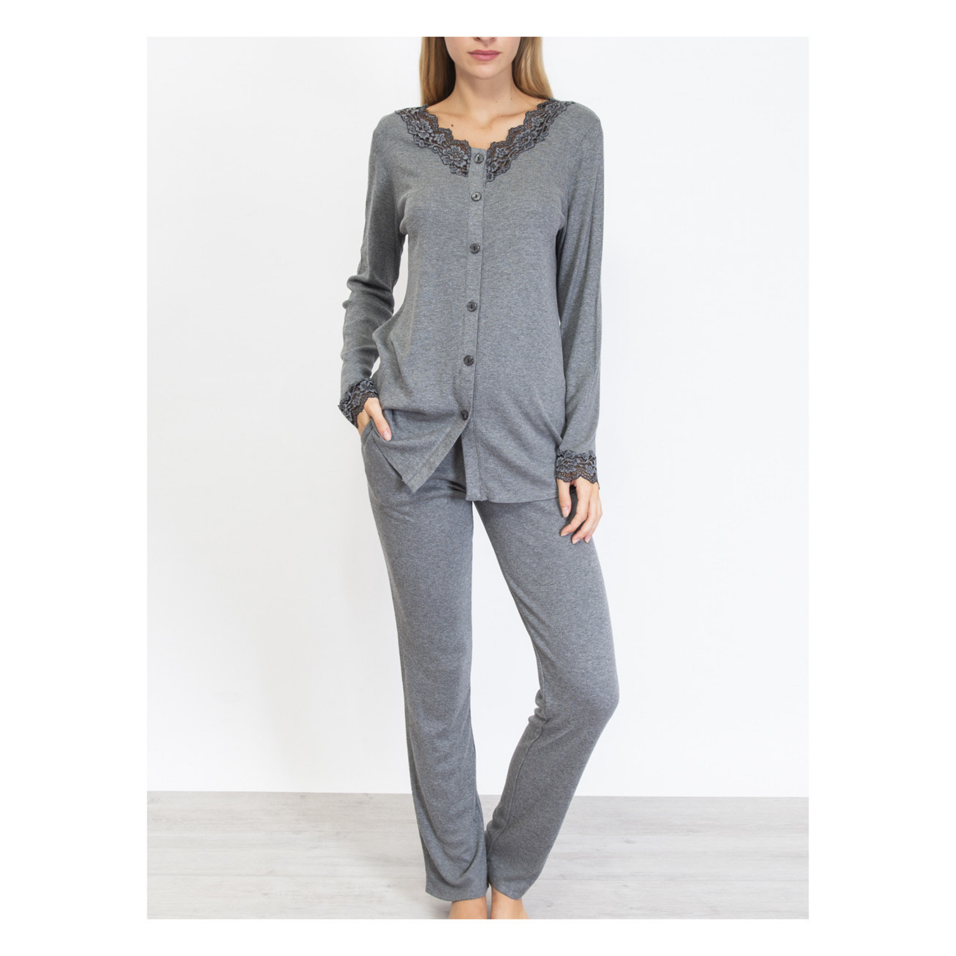 Pigiama con maglia aperta con scollo a V e pantalone lungo realizzato in morbida costina di viscosa. La maglia a manica lunga è impreziosita da una balza in pizzo a motivo floreale e bottoncini a contrasto. Il pantalone lungo dal taglio dritto è dotato di pratiche tasche. Comodo pigiama caratterizzato da elementi casual e romantici che si combinano perfettamente tra loro creando un mix unico e sofisticato.