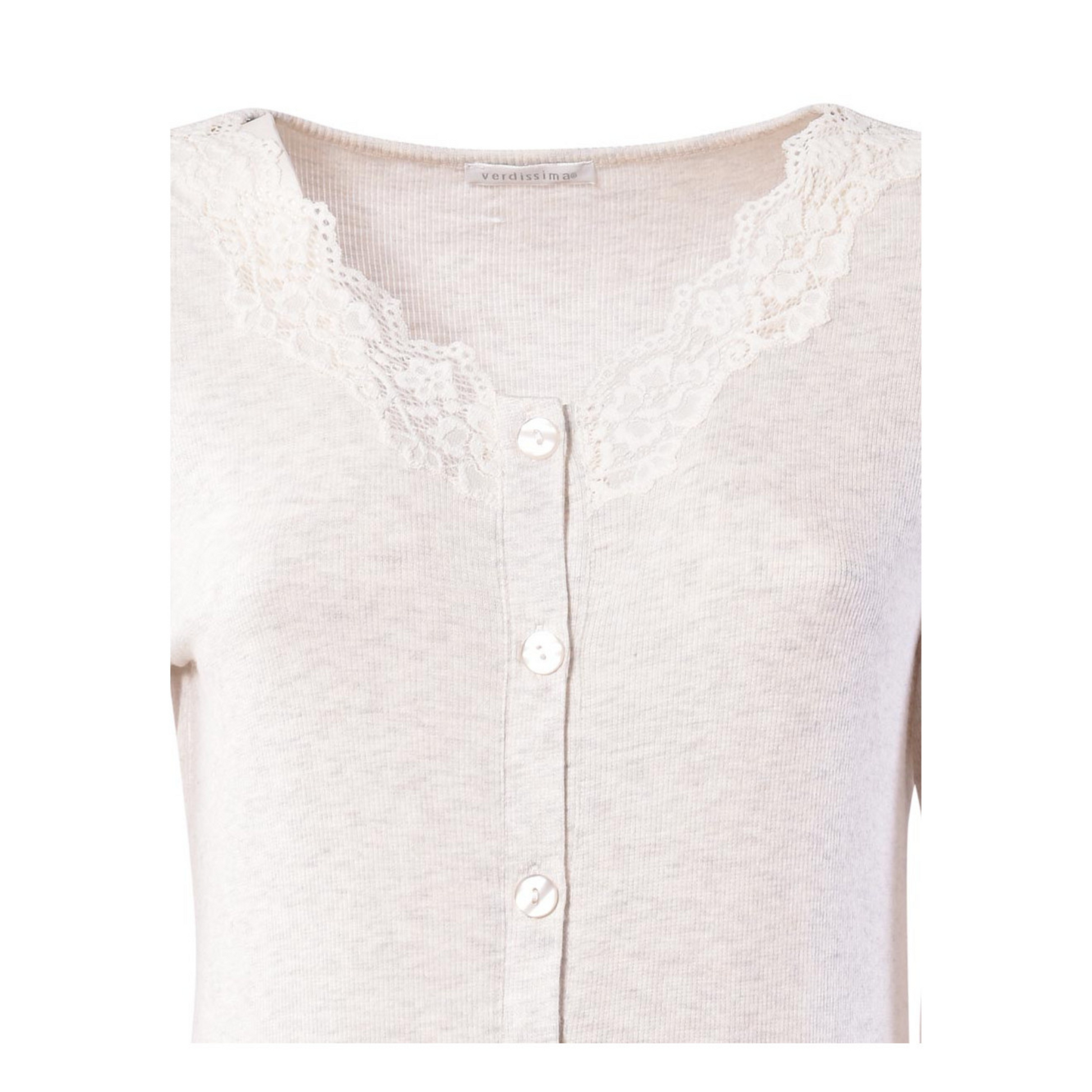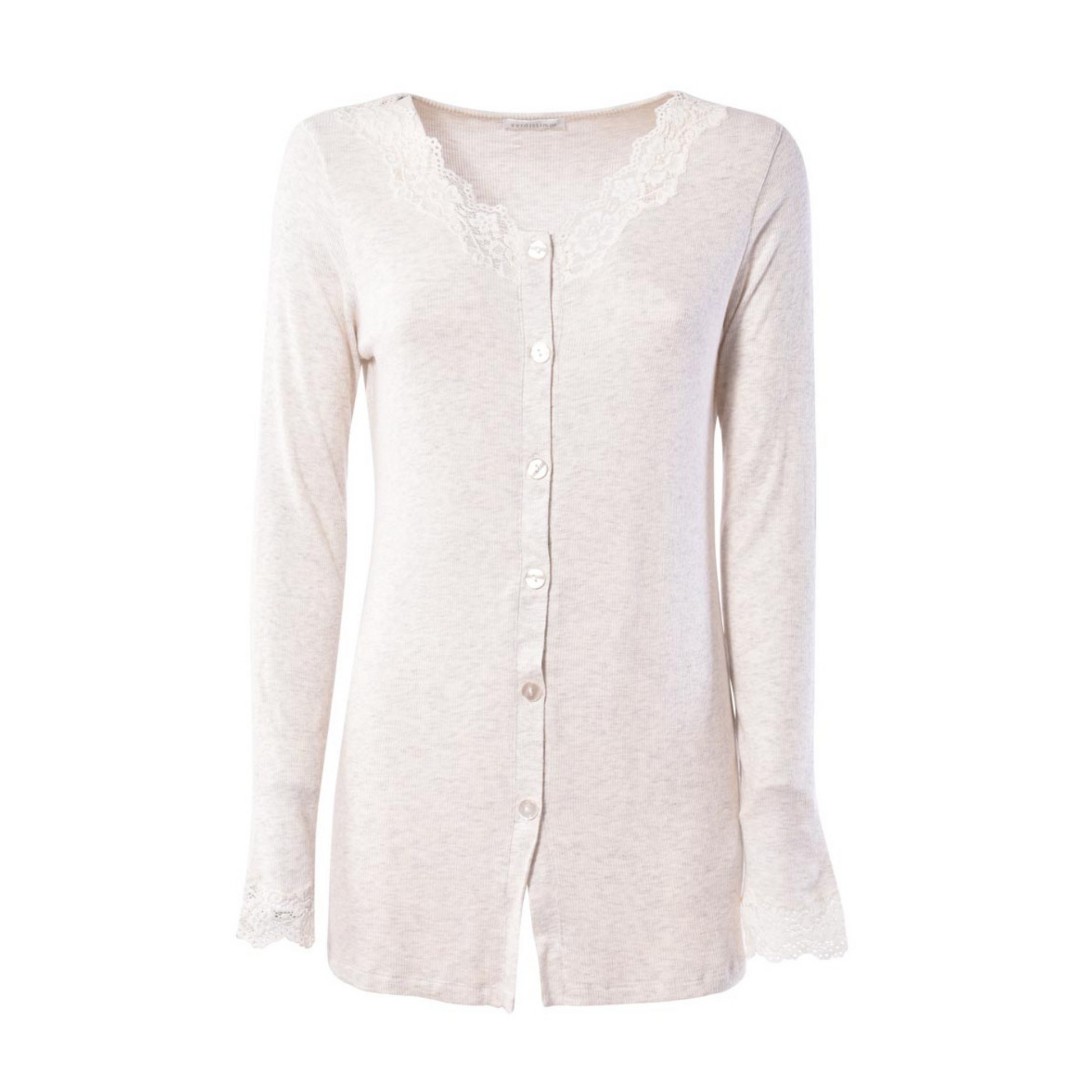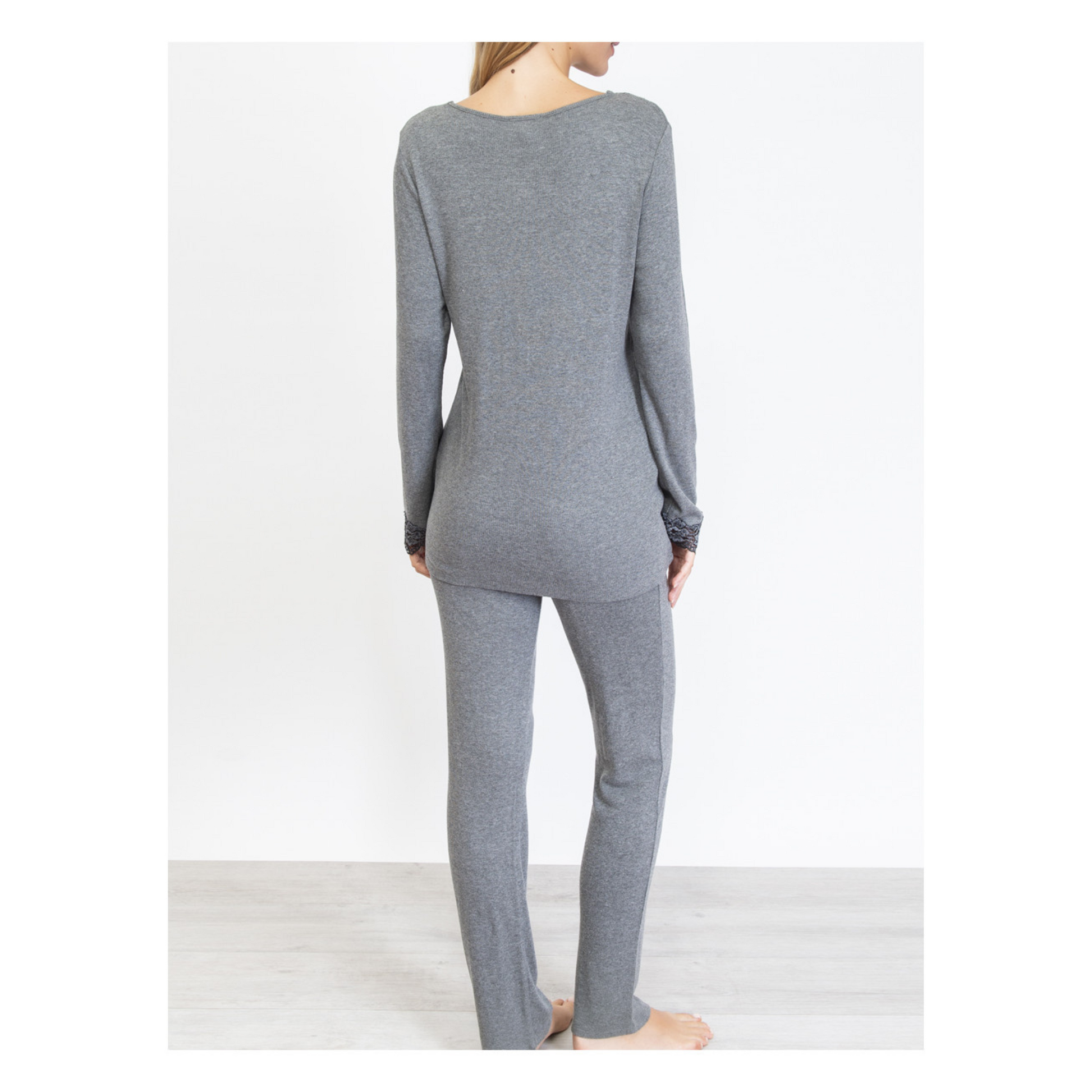 Pigiama con maglia aperta con scollo a V e pantalone lungo realizzato in morbida costina di viscosa. La maglia a manica lunga è impreziosita da una balza in pizzo a motivo floreale e bottoncini a contrasto. Il pantalone lungo dal taglio dritto è dotato di pratiche tasche. Comodo pigiama caratterizzato da elementi casual e romantici che si combinano perfettamente tra loro creando un mix unico e sofisticato.