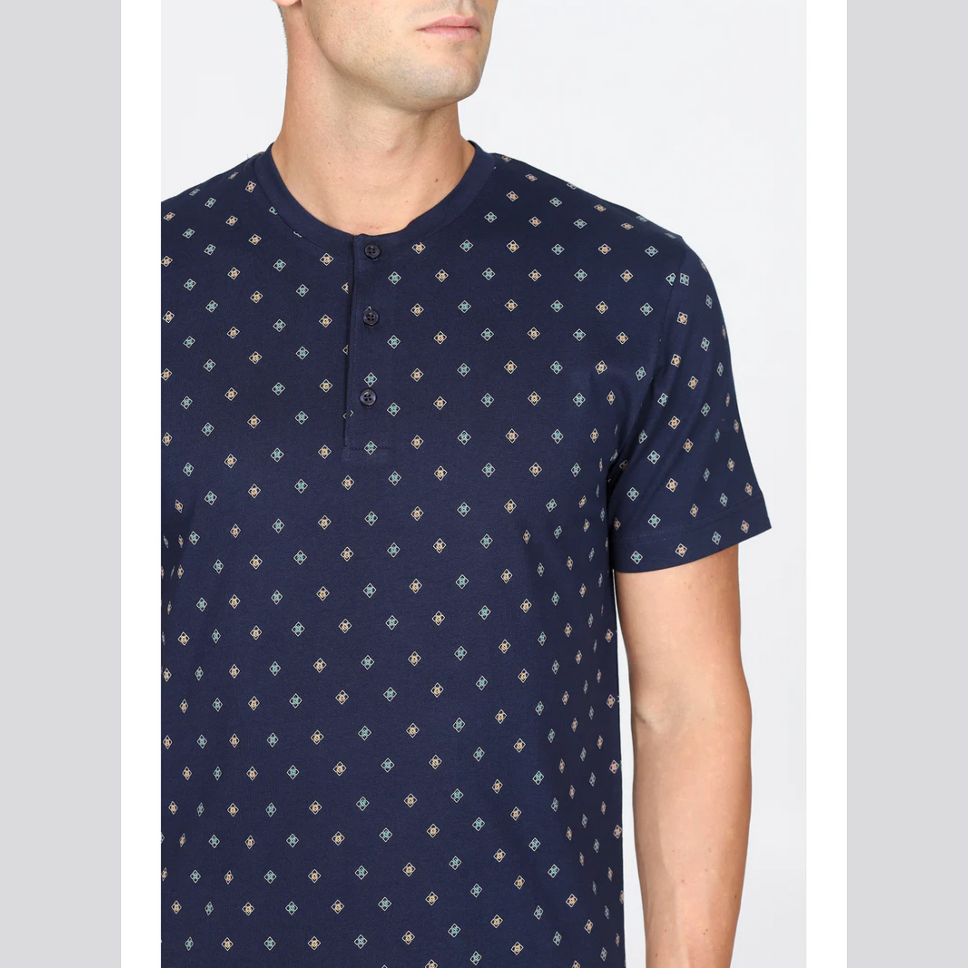 La maglia con scollo serafino è arricchita da una raffinata fantasia ispirata ai disegni cravatteria, mentre il pantalone corto in tinta unita blu crea un perfetto equilibrio tra sobrietà e stile. La particolare lavorazione del filato impedisce la torsione delle cuciture dopo i lavaggi, mantenendo forma e vestibilità inalterate nel tempo.
