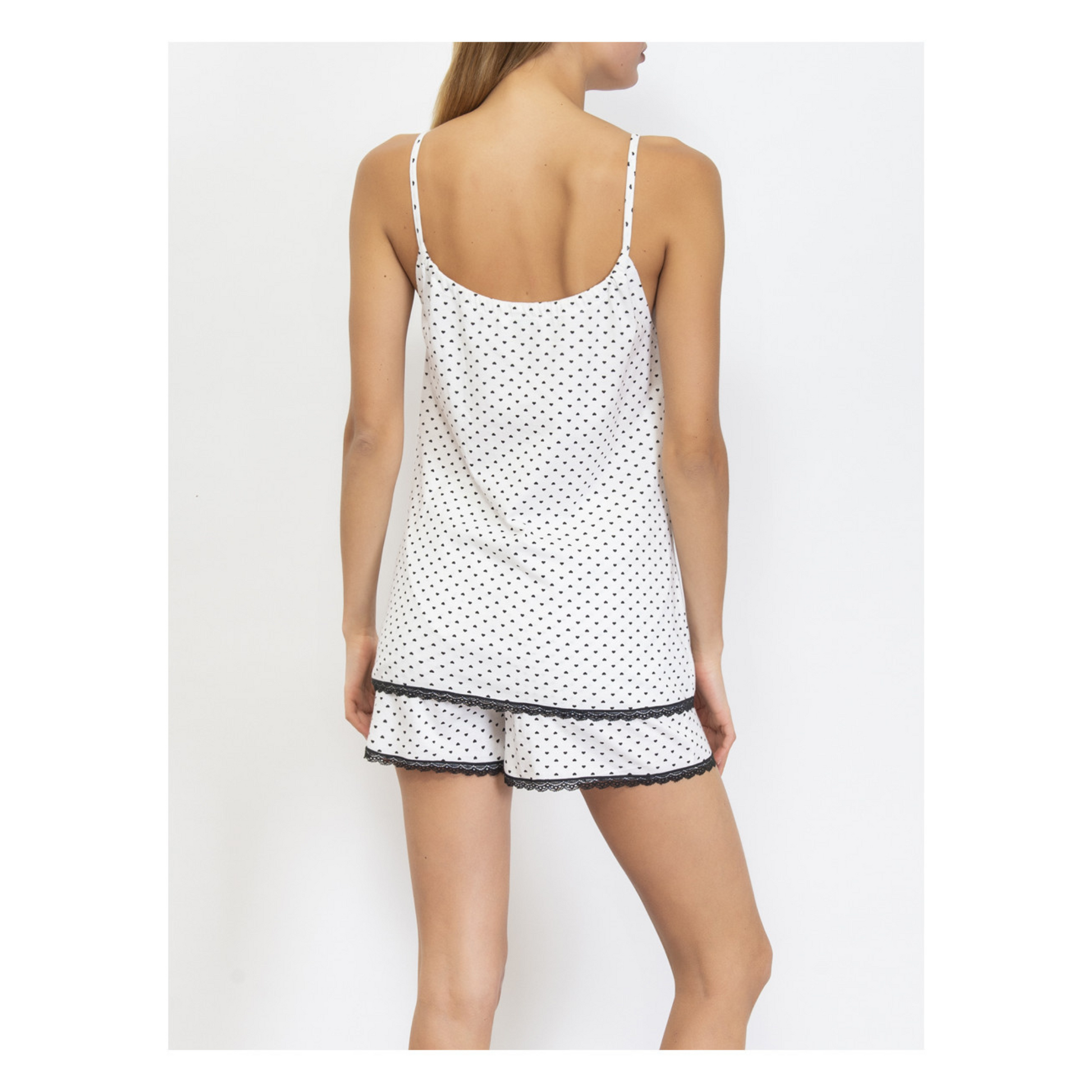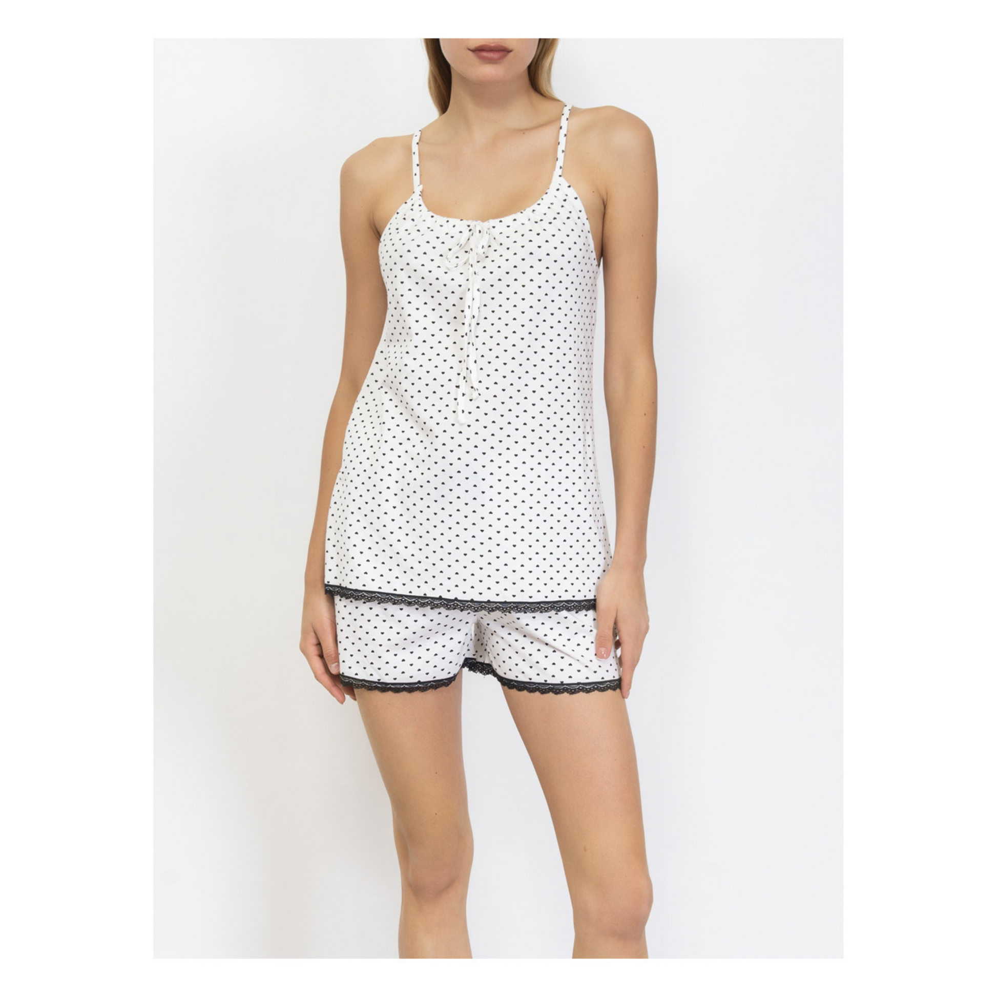 Il top con spallina sottile offre una vestibilità leggera e comoda, ideale per le notti estive o per chi preferisce sentirsi liberi durante il sonno. Il pantaloncino, con la sua fantasia coordinata, completa il look con un tocco di stile e praticità.