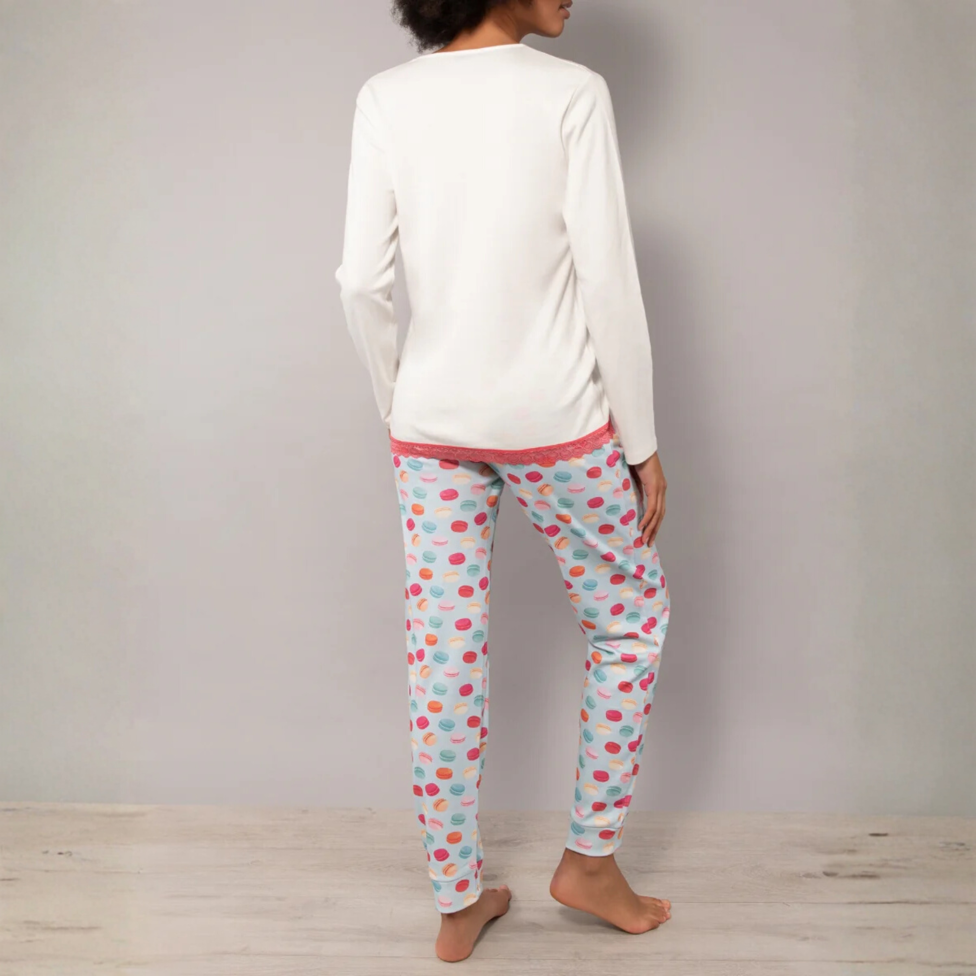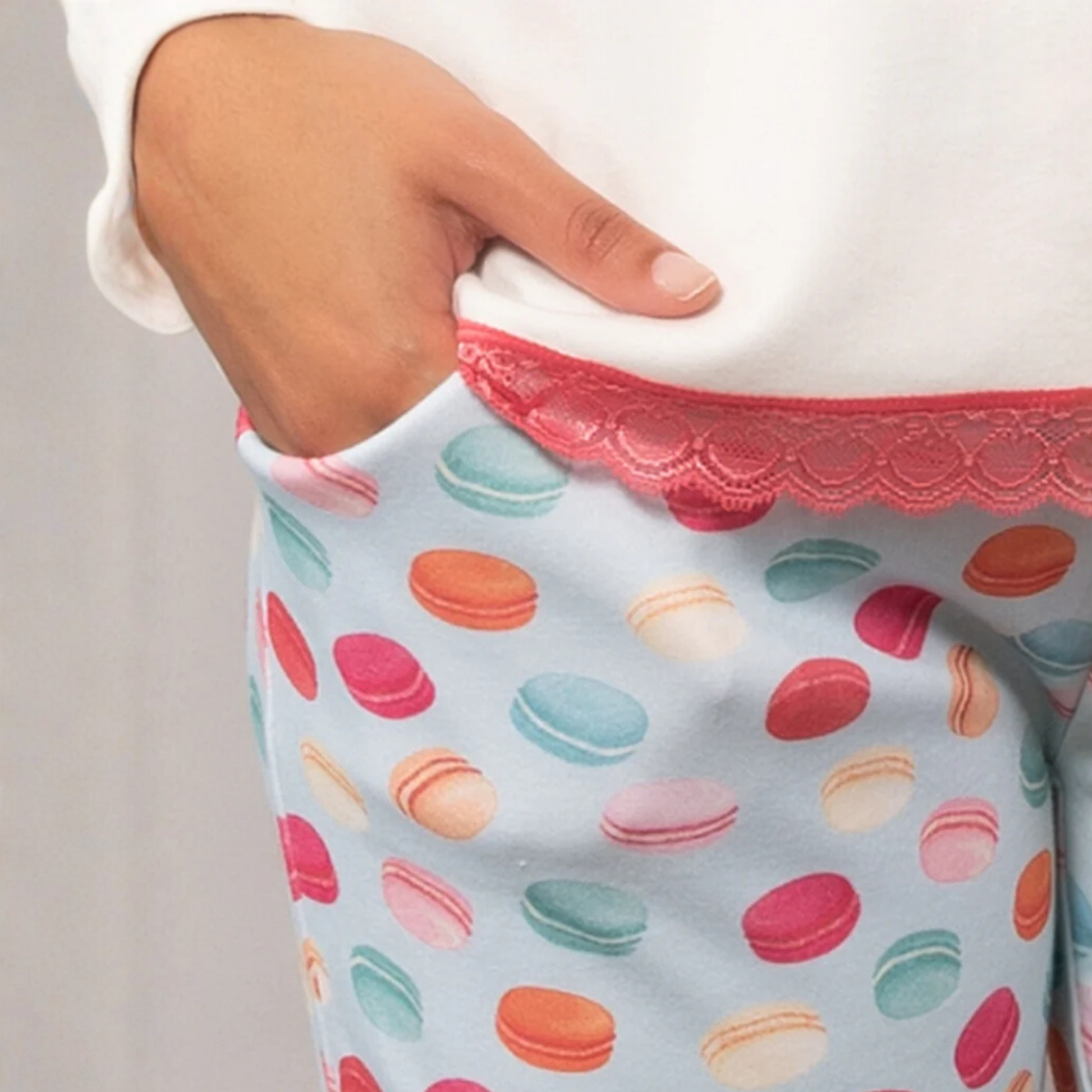 Il pantalone abbinato, con tasche laterali, ha un vivace fondo azzurro decorato da tanti macarons, creando un look coordinato fresco, allegro e super confortevole per il relax quotidiano.