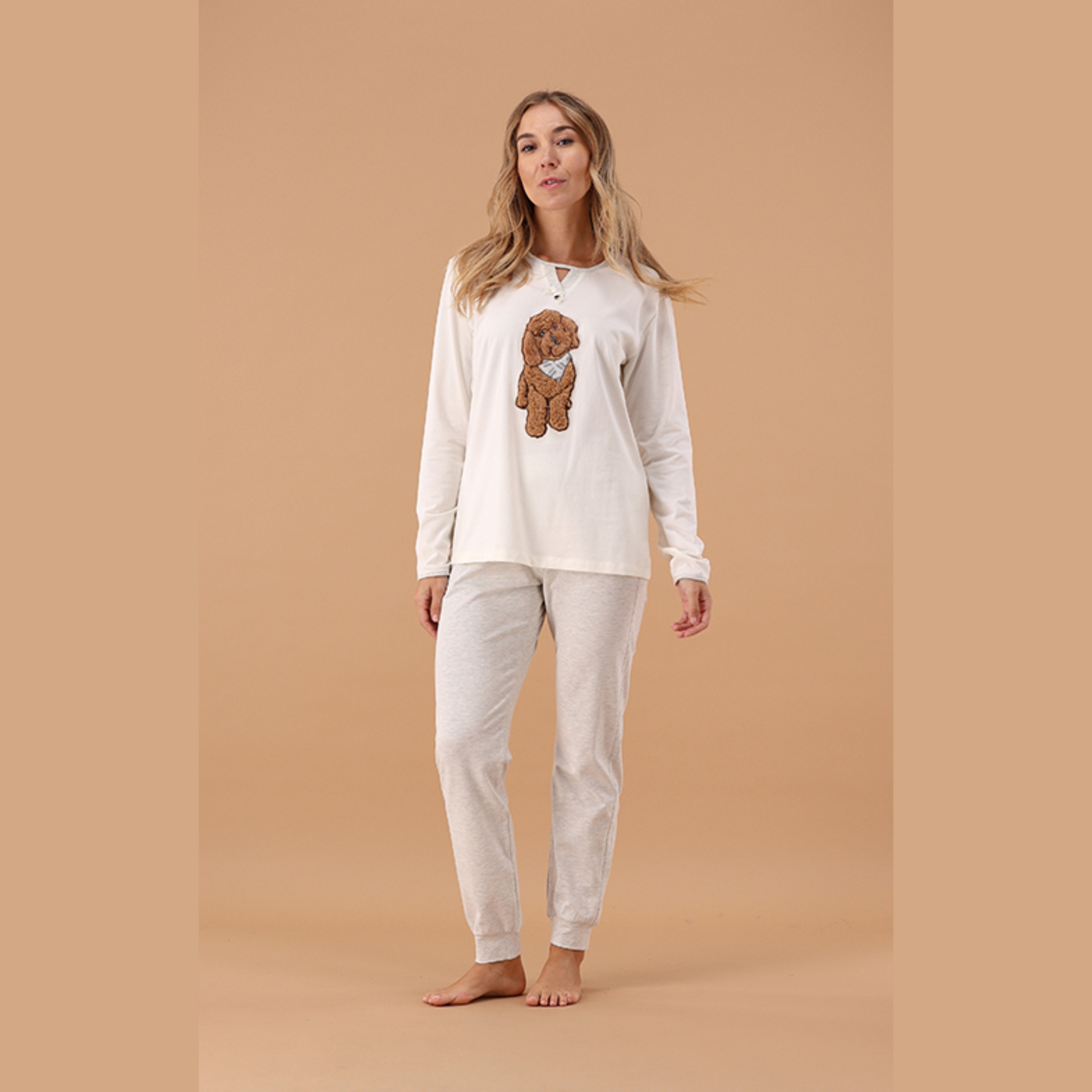 La maglia ha un fit comodo ma non largo, con polsi e collo a contrasto, in perfetta armonia con il pantalone coordinato. Realizzato in jersey stretch leggermente smerigliato, questo pigiama è piacevole a contatto con la pelle e risponde alle nuove esigenze di comfort per affrontare inverni sempre più miti, senza rinunciare alla morbidezza.
