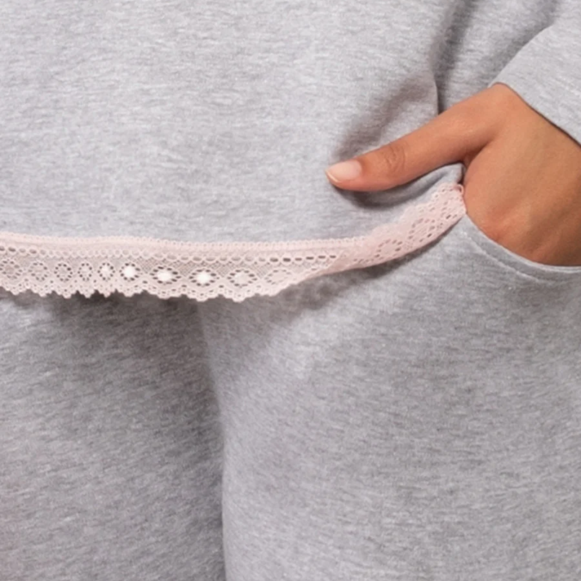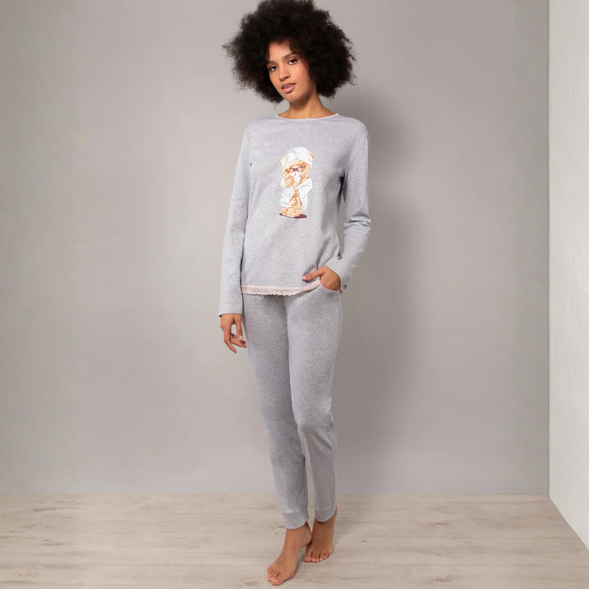 Il Pigiama Lungo M-TE12 è la scelta ideale per chi ama la comodità senza rinunciare a un tocco di tenerezza. La maglia grigio tinta unita con girocollo presenta una simpatica stampa centrale di un orsetto che si rilassa bevendo una tisana, perfetta per chi vuole portare un po’ di dolcezza nelle proprie serate. Il delicato bordo in pizzo rosa aggiunge un dettaglio femminile e raffinato.