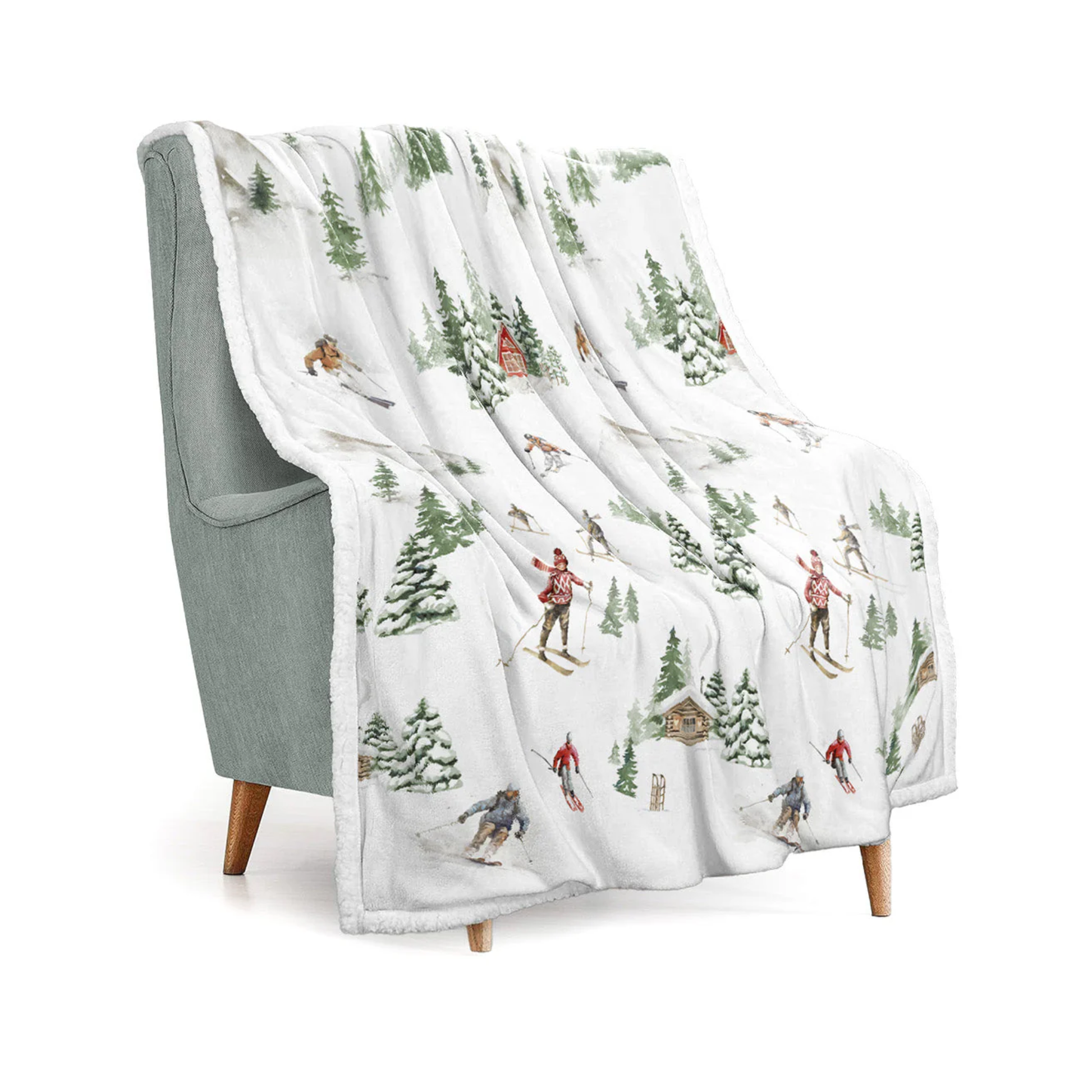 Il design è arricchito da una stampa digitale che raffigura paesaggi innevati, abeti stilizzati e sciatori che sfrecciano sulla neve, richiamando tutta l’atmosfera delle piste alpine. Il retro in agnellato bianco rende il plaid ancora più accogliente e confortevole, perfetto per i momenti di relax nelle fredde giornate invernali.
