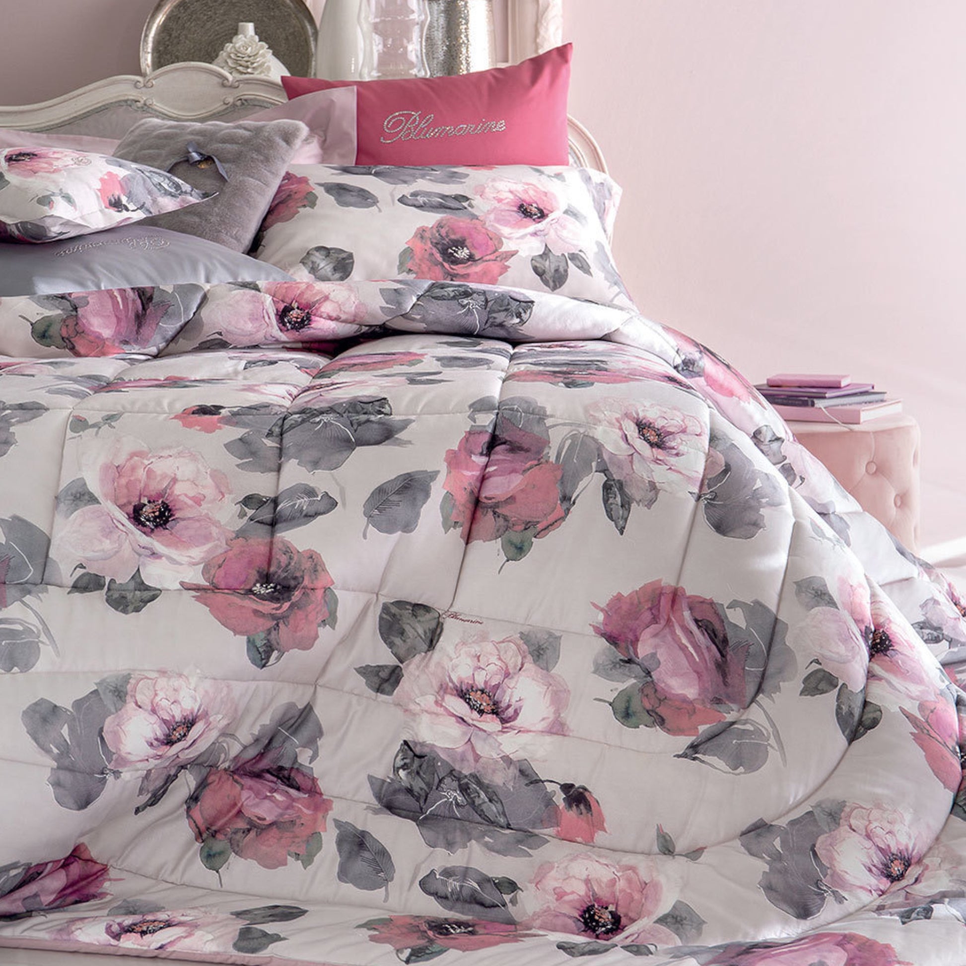 Trapunta matrimoniale con stampa floreale all over.